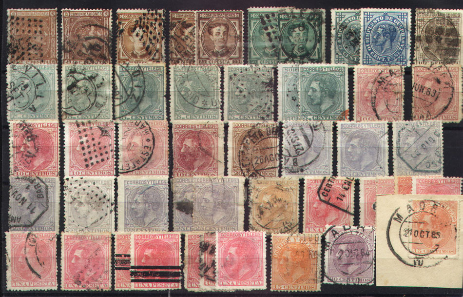 Ficha con sellos Alfonso XII diferentes emisiones y variados matasellos.