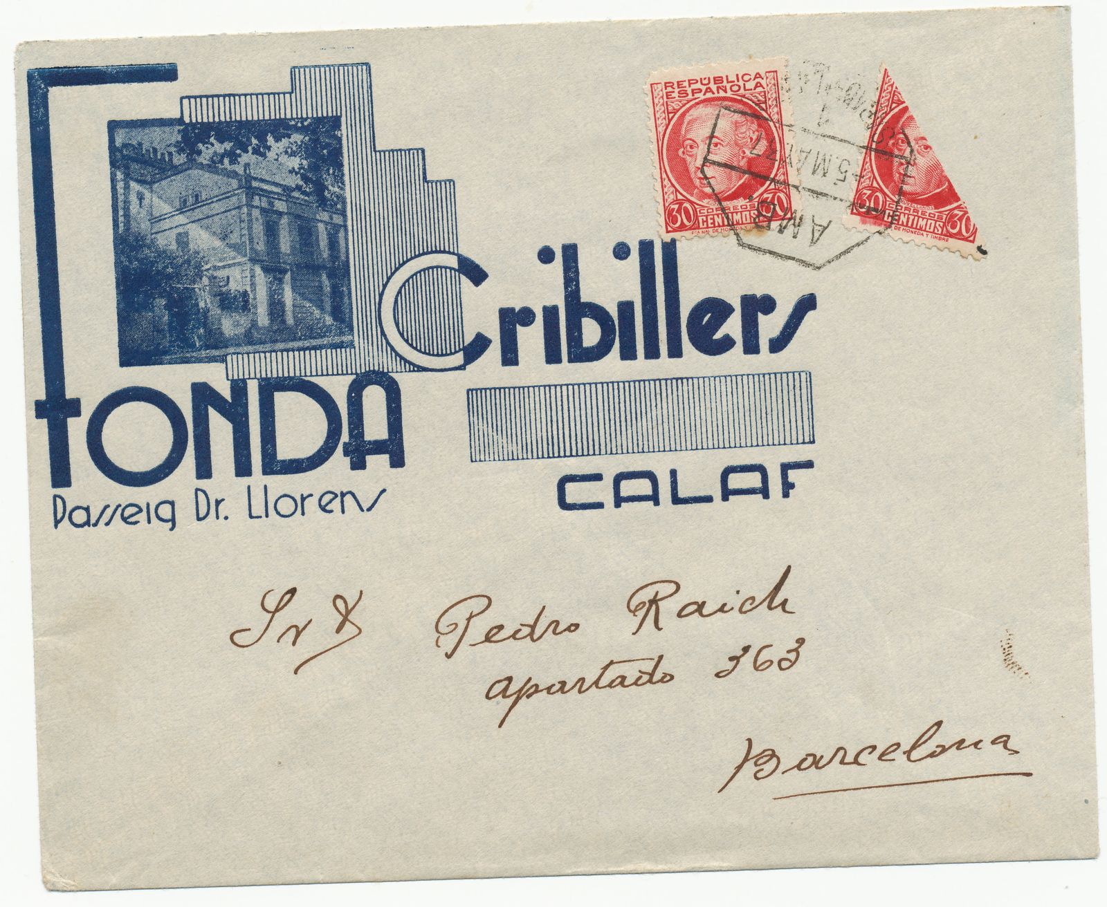 Parece raro que salga de Calaf, por el membrete comercial, si bien he considerado que en aquellos años (y en otras épocas) los agentes comerciales cogían los sobres de las fondas y los hoteles y luego echaban las cartas donde fuese, por lo que no necesariamente el remitente era la entidad del membrete comercial. O sí, vete a saber.