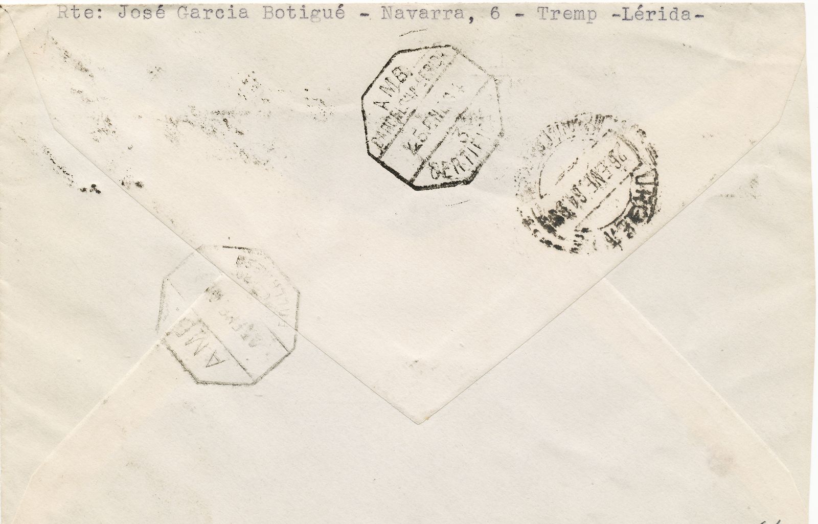 Ambulante. Barcelona-Lérida. AMB. Barcelona-Lerida. 3. Certificado. 1964-01-25. Carta. Reverso. Baja.jpg