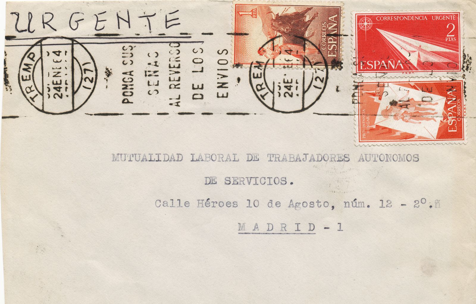 Pese a que lleva una indicación de URGENTE, no parece que aplicasen la tarifa de urgencia (que era de 20 céntimos). Más bien, es un comentario sobre el contenido para que el destinatario no demorase su apertura y supiese lo que tenía que hacer con la misma.