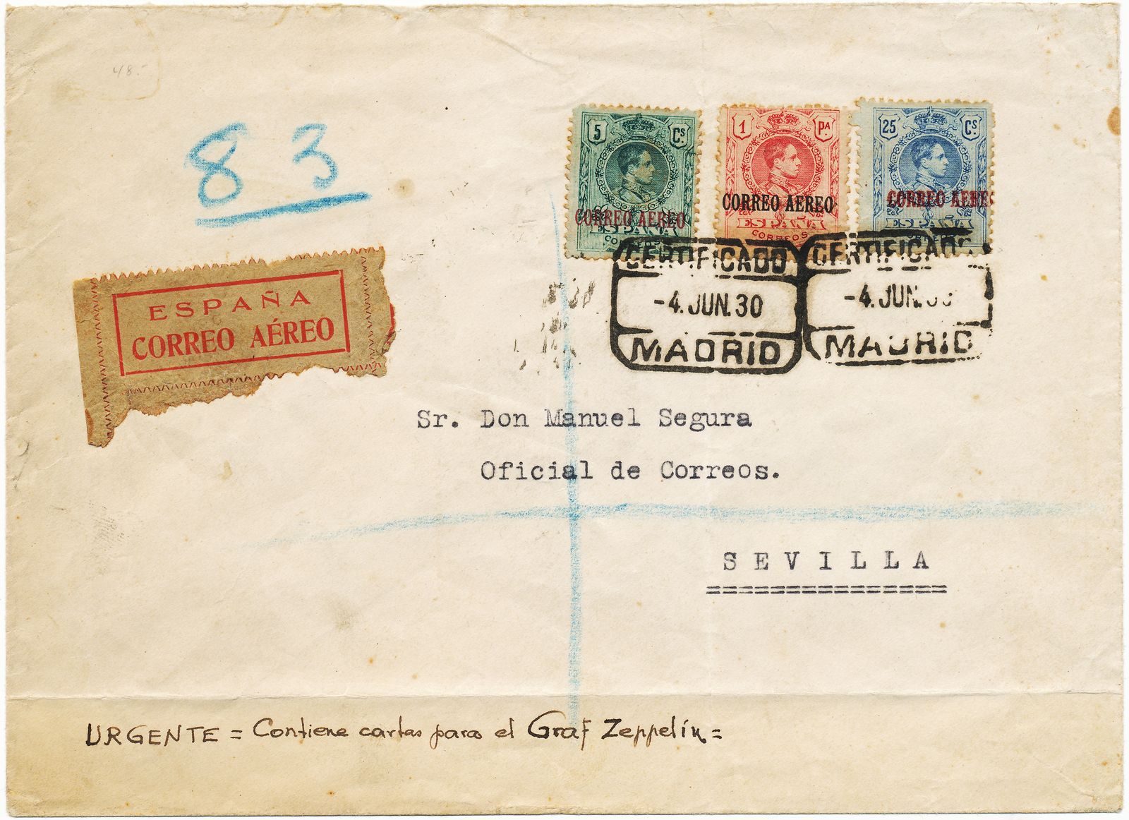 Pensarían que al día siguiente sería ya tarde para que por avión llegase a Sevilla antes que el Graff Zeppelin (que efectivamente hizo una breve parada en Sevilla el día 5 de junio de 1930 para recoger y entregar correo) y decidieron encaminarla por ferrocarril. Llegó a Sevilla el día 5 de junio (parece que a las 11 de la mañana) y, se supone, cumplió su cometido de entregar el contenido para el vuelo del Graff Zeppelin, pero desconozco la hora de la arribada del mismo. En todo caso, llegó antes que si hubiese ido por avión el mismo día 5.