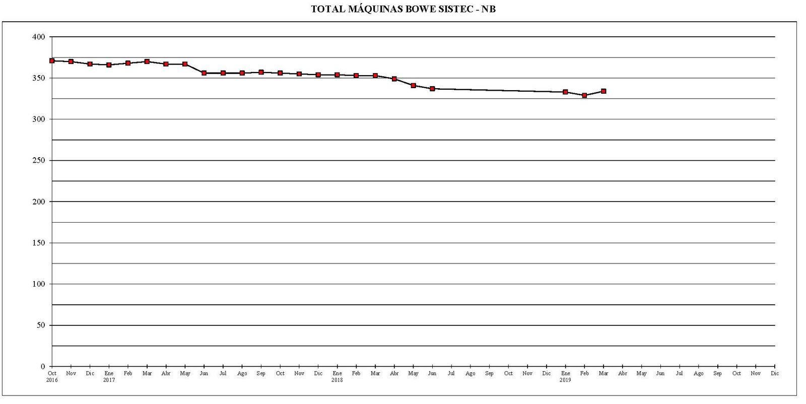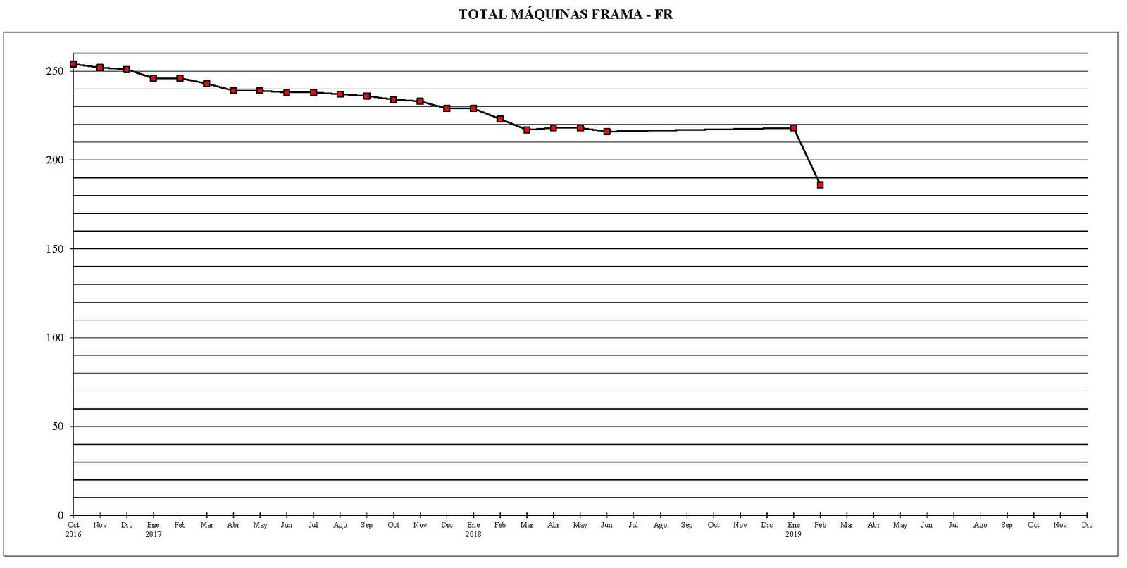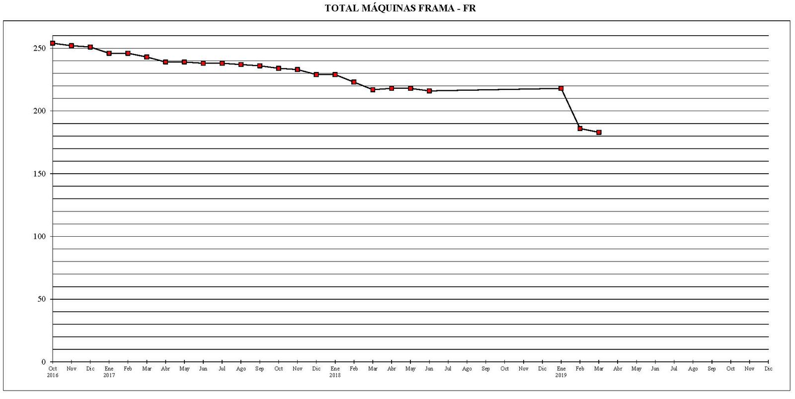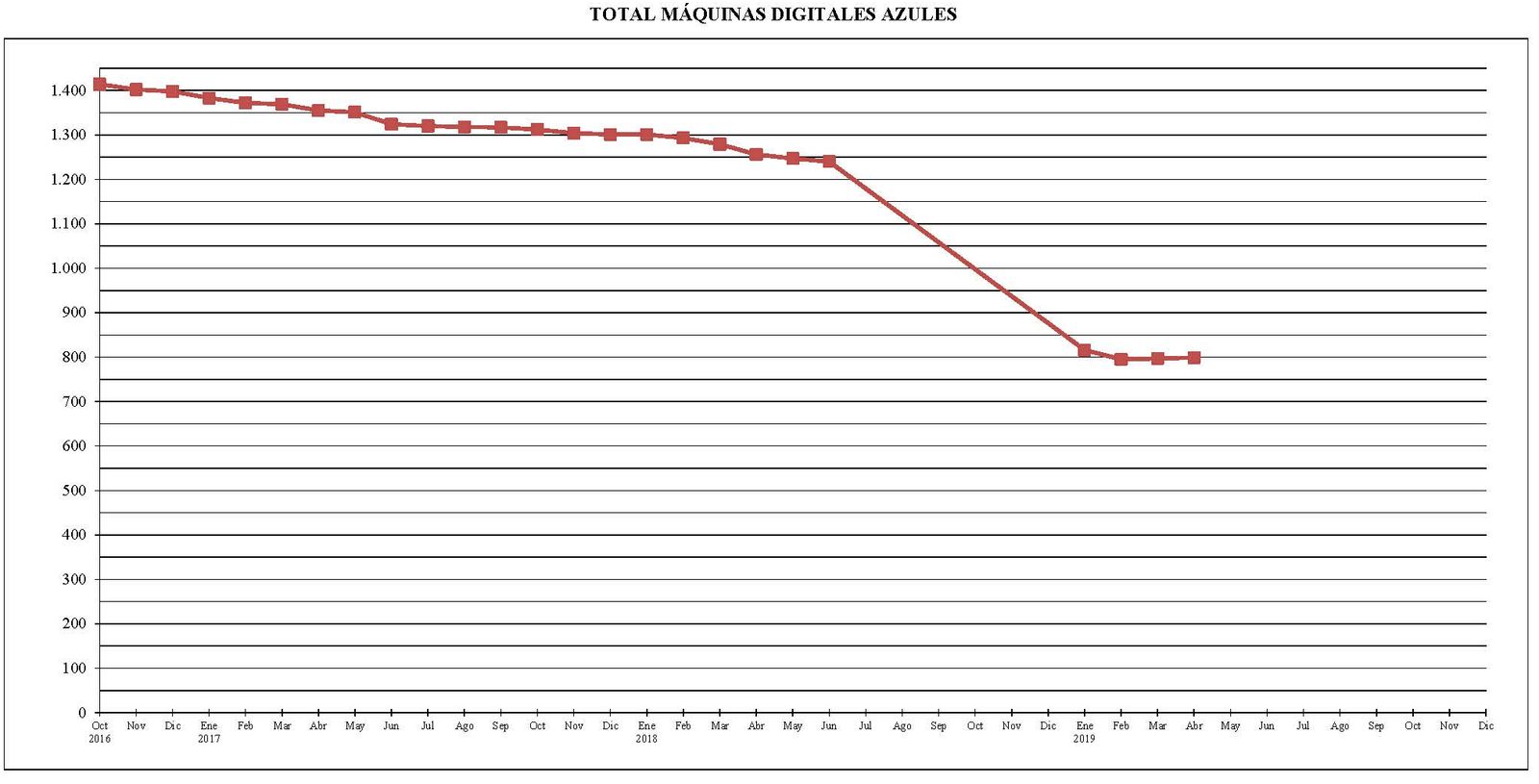 Se puede observar que, salvo el mes de enero del año 2018 que no hubo ninguna variación y en los meses de marzo y abril del año 2019 que hubo un pequeño repunte de 2 máquinas, en el resto de los meses estudiados (con la salvedad del período entre junio del año 2018 y enero del año 2019 que está tratado de forma conjunta), las bajas fueron superiores a las altas. Desde el mes de octubre del año 2016 al actual, el parque total de máquinas ha sufrido un descenso de 615 unidades.