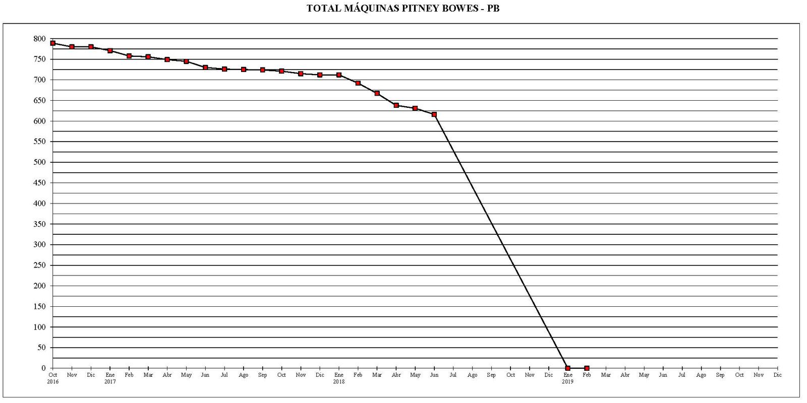 - Al 28 de febrero del año 2019, existían un total de 795 máquinas de franquear digitales en funcionamiento. El parque existente se había reducido en 21 máquinas en comparación con el final del mes anterior.
