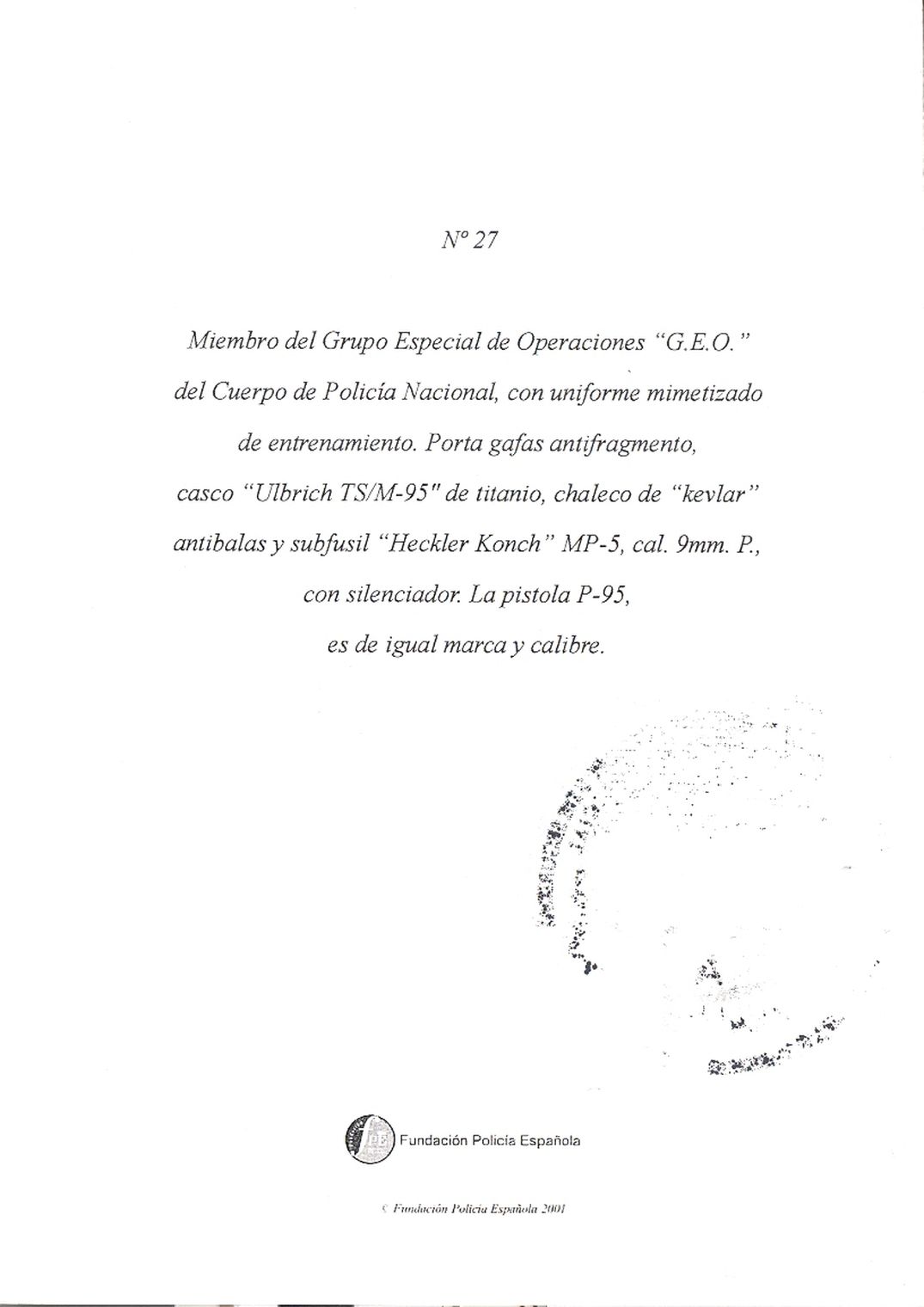 Y también muestro otra de ellas, la número 27, correspondiente a la figura de un miembro del Grupo Especial de Operaciones "G. E. O.", de 1985, con uniforme mimetizado de entrenamiento. Anverso y reverso.