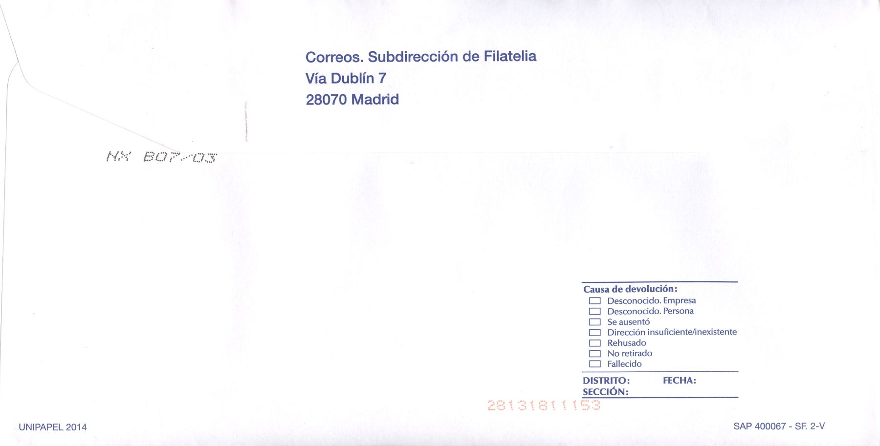 Ante lo extraño de este caso, recabaremos la información de la Subdirección de Filatelia, a ver si en algo nos pueden orientar.