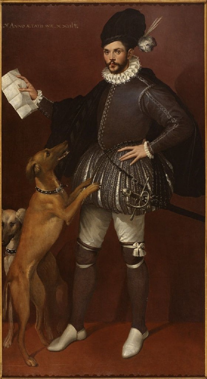 "Retrato de caballero con carta y dos perros" (sobre 1580), de Bartolomeo Passerotti. Óleo sobre tela,  197.5 x 114.9 cm