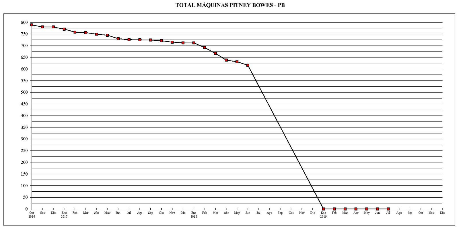 - Al 31 de julio del año 2019, existían un total de 794 máquinas de franquear digitales en funcionamiento. El parque existente, se había reducido en 3 máquinas en comparación con el final del mes anterior.