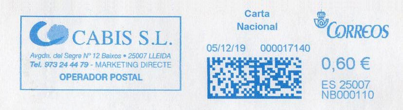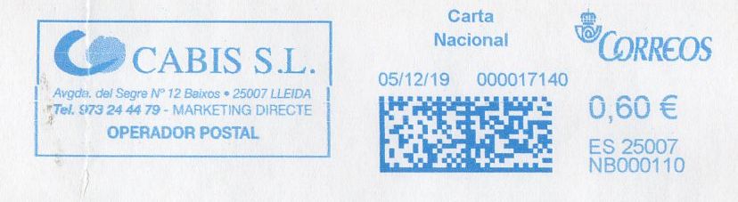 Repasando el catálogo de las Frama veo muy pocas empresas de marketing directo o de mailing...y las que hay, o había, no han pasado de ser empresas consolidadoras, bien por que les pilló la crisis del 2008, que es justo cuando aparecen, o por que son muy costosas. Una que ha resistido y ahora es Operador Postal es CABIS S.L de Lerida titular de la FR000185 que acompaño con esta imagen:Azul620.jpg