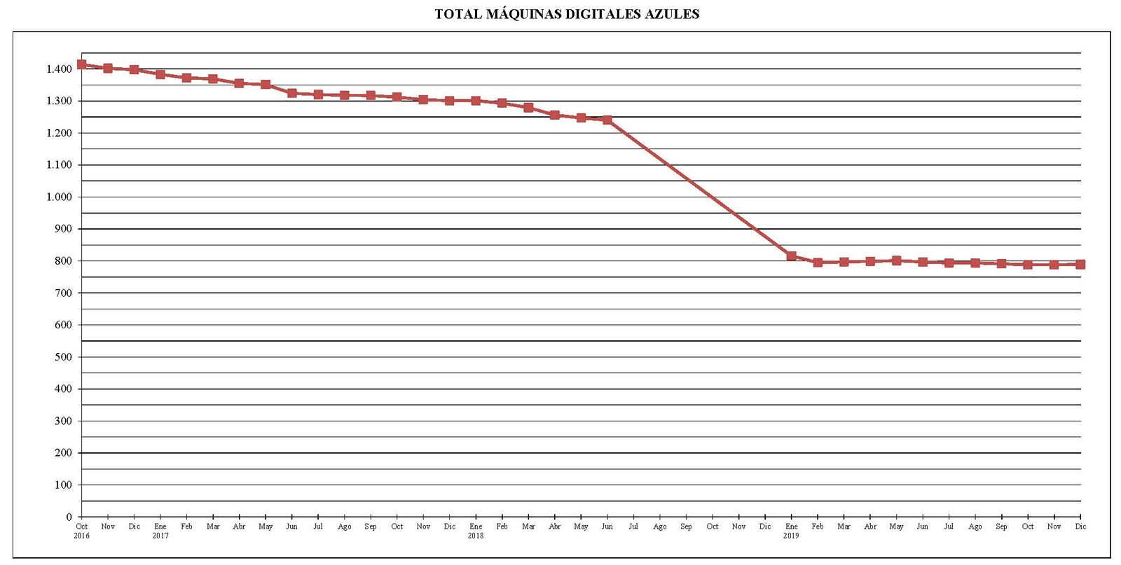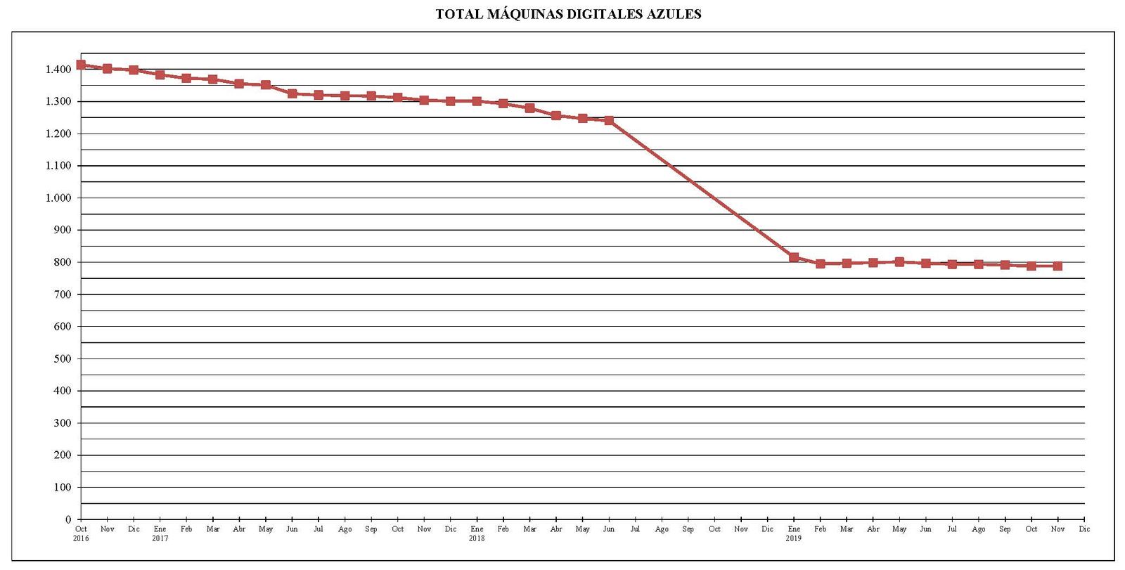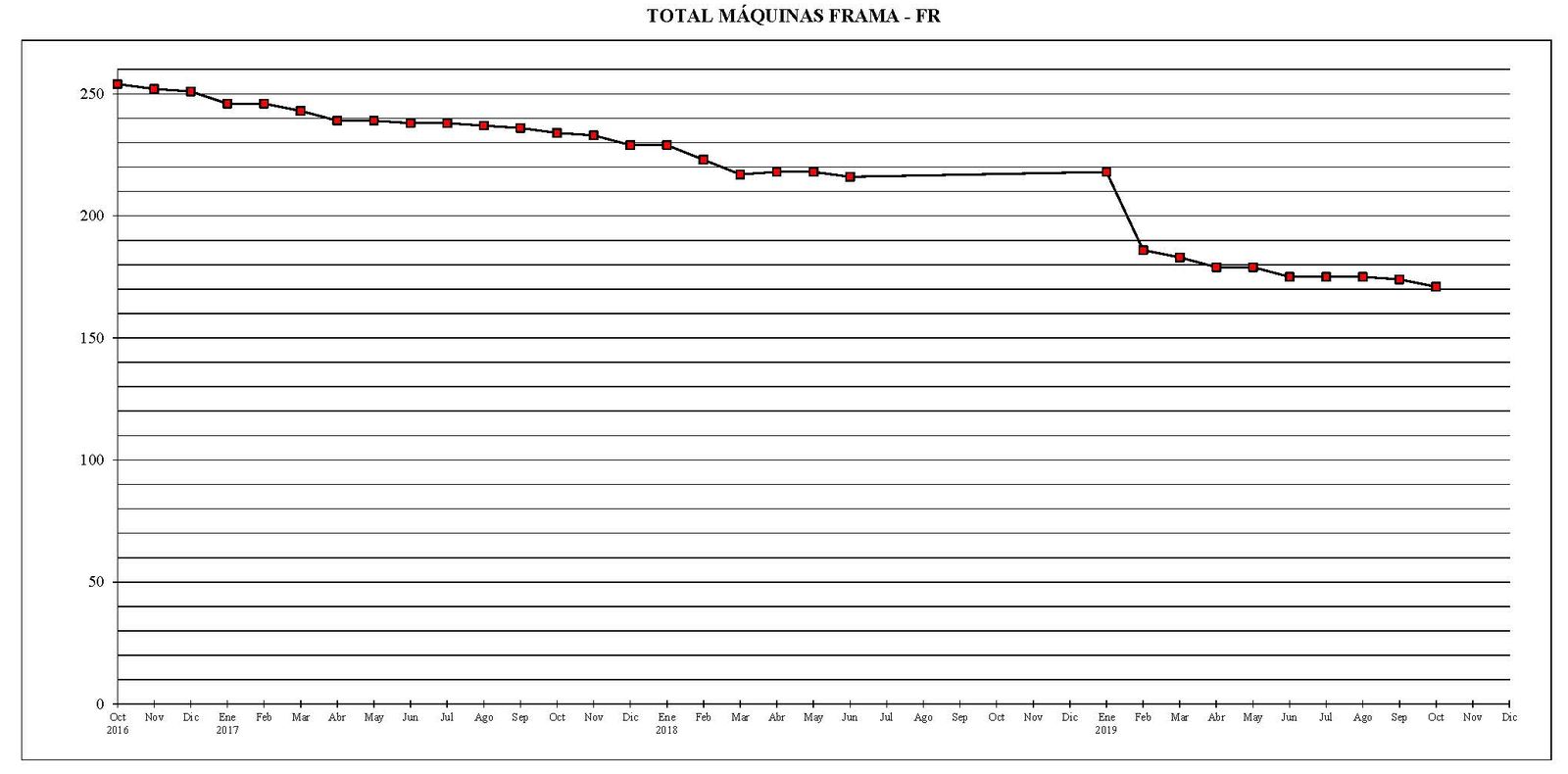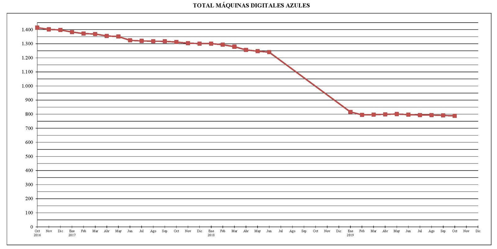 Desde el mes de octubre del año 2016 al actual, el parque total de máquinas ha sufrido un descenso de 626 unidades.