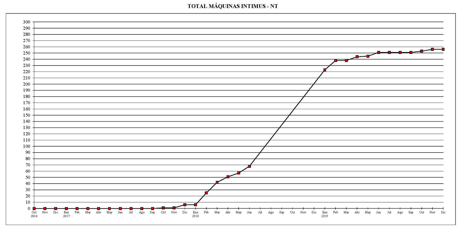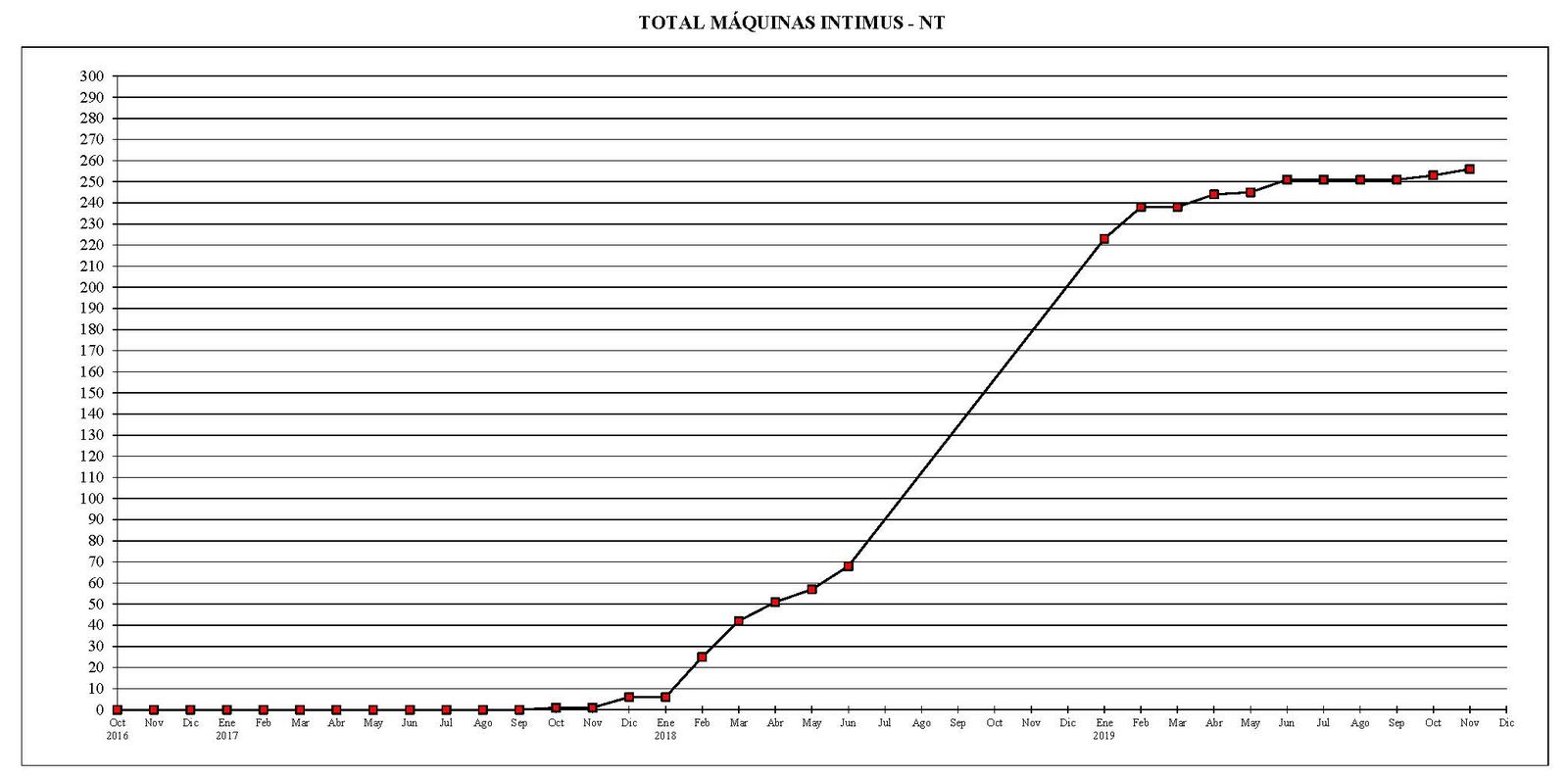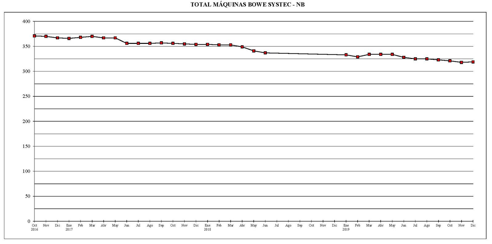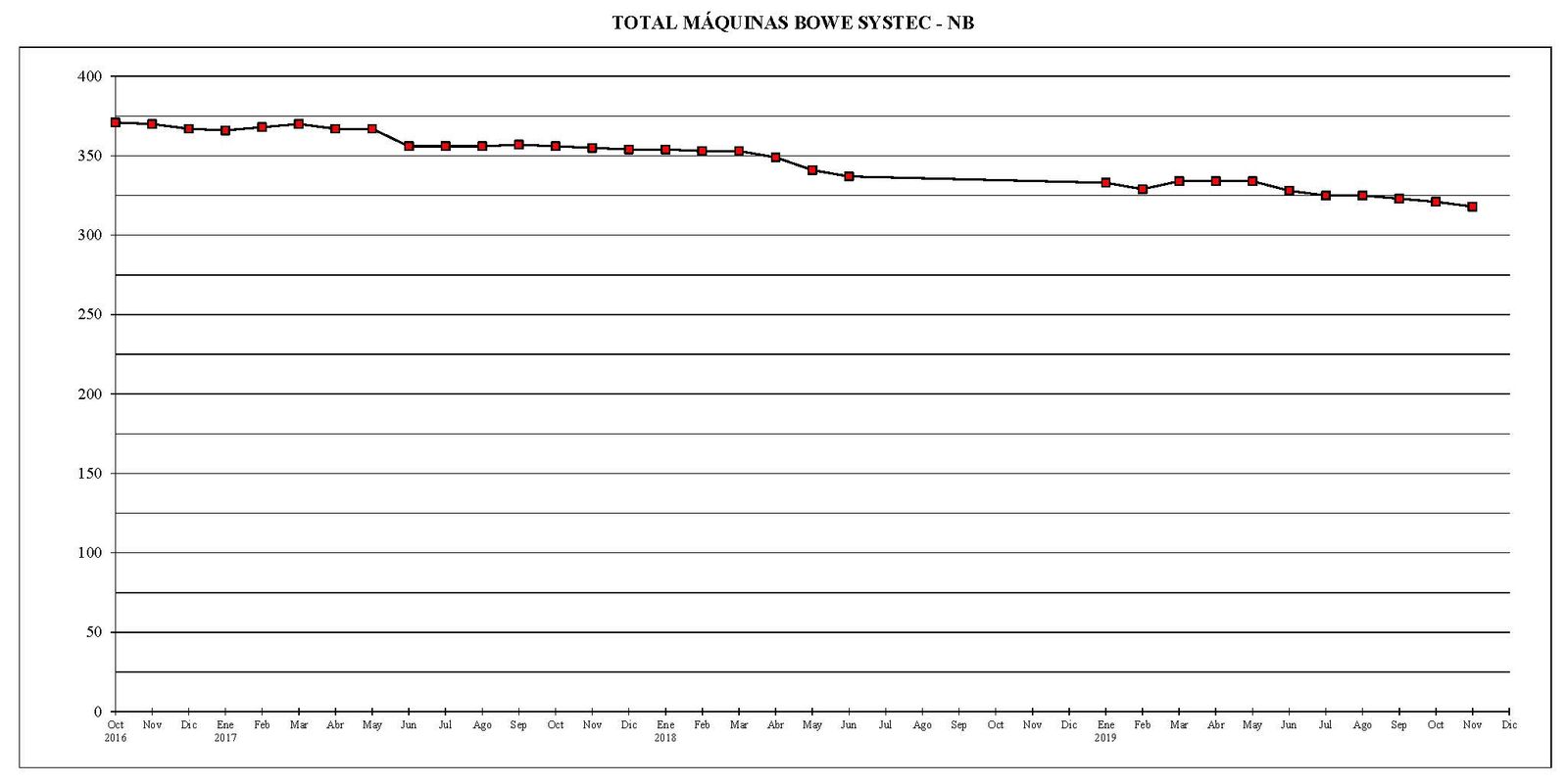 Se puede observar que, salvo el mes de enero del año 2018, agosto y noviembre del año 2019 en los que no hubo ninguna variación y en los meses de marzo, abril y mayo del año 2019 que hubo un pequeño repunte de 2 máquinas, en cada uno de ellos, en el resto de los meses estudiados (con la salvedad del período entre junio del año 2018 y enero del año 2019 que está tratado de forma conjunta), las bajas fueron superiores a las altas.