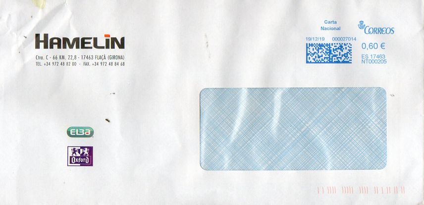 La empresa francesa Hamelin, ubicada en Girona y dedicada a la venta de productos escolares y para oficina, franqueaba su correspondencia con una pitney de baja capacidad ( PB300927) que no tenemos catalogada. Con la baja de todas las pitneys ahora franquea sus envíos con esta intimus cuya capacidad de trabajo es igual en todas sus máquinas...creo: