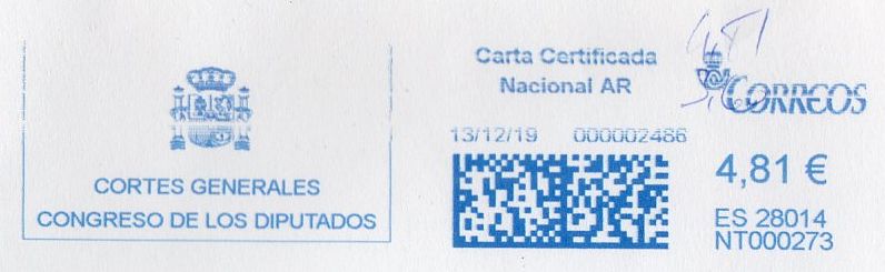 La pitney de las CORTES GENERALES CONGRESO DE LOS DIPUTADOS convertida en intimus NT000273 y seguimos sin ver un franqueo digital azul con el nuevo logotipo de Correos. Ya nos vale....y en San Filatelio se ha volatilizado :wink: