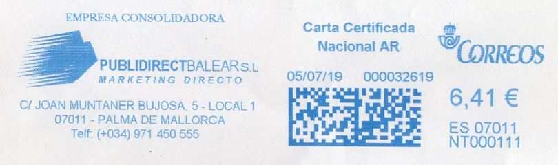 En febrero del 2019 se dio de alta la máquina NT000111 de la empresa consolidadora PUBLIDIRECTBALEAR y que ahora reproduzco: