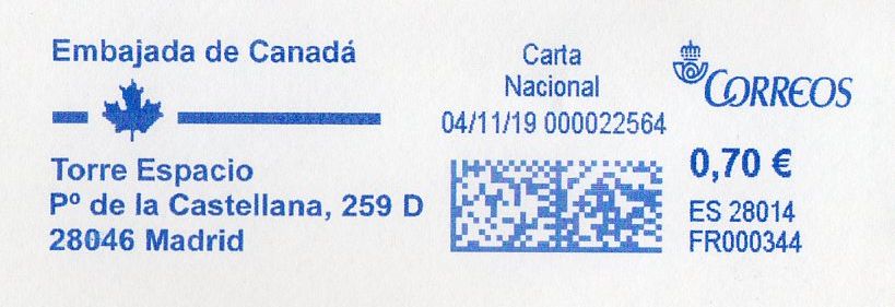 La embajada de Canadá sigue estando en Castellana, 259 D, Madrid, y sigue utilizando la FR000344