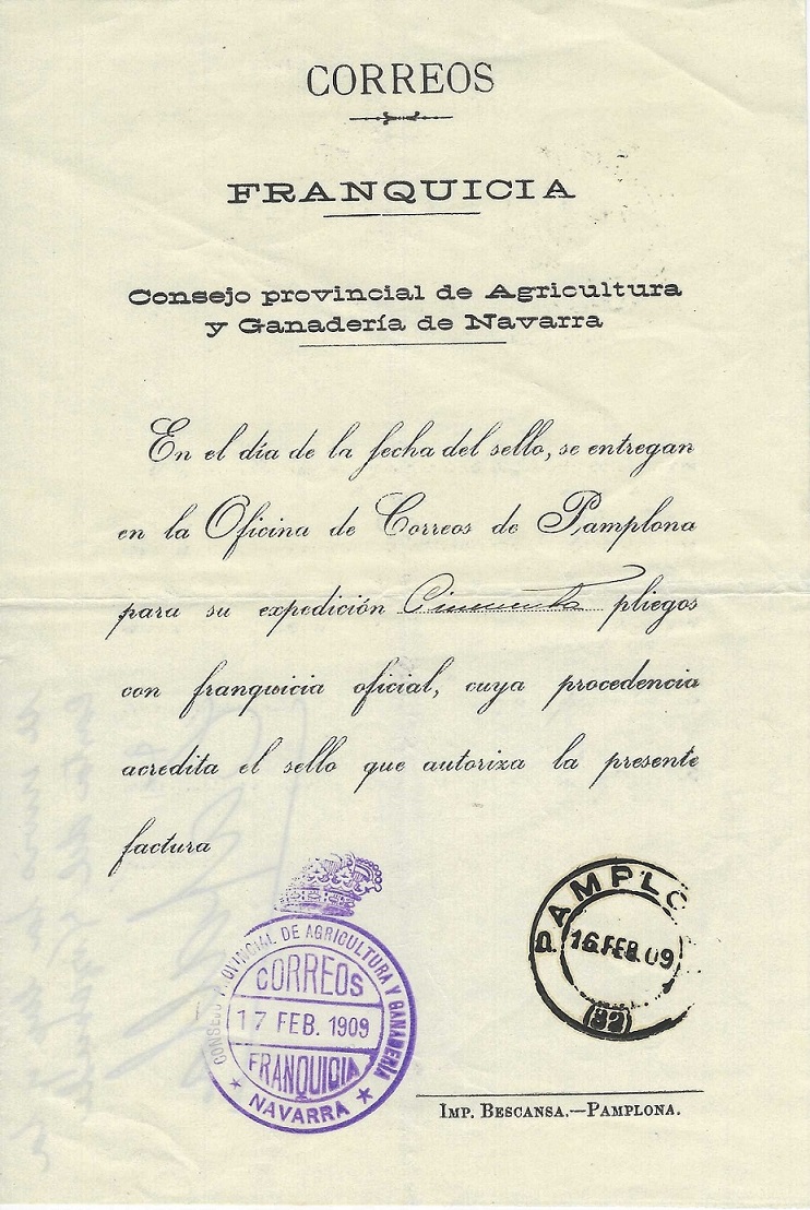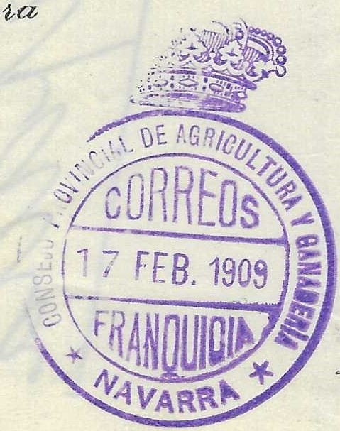 CONSEJO PROVINCIAL DE AGRICULTURA Y GANADERIA - CORREOS - 17 FEB. 1909 - FRANQUICIA - NAVARRA-