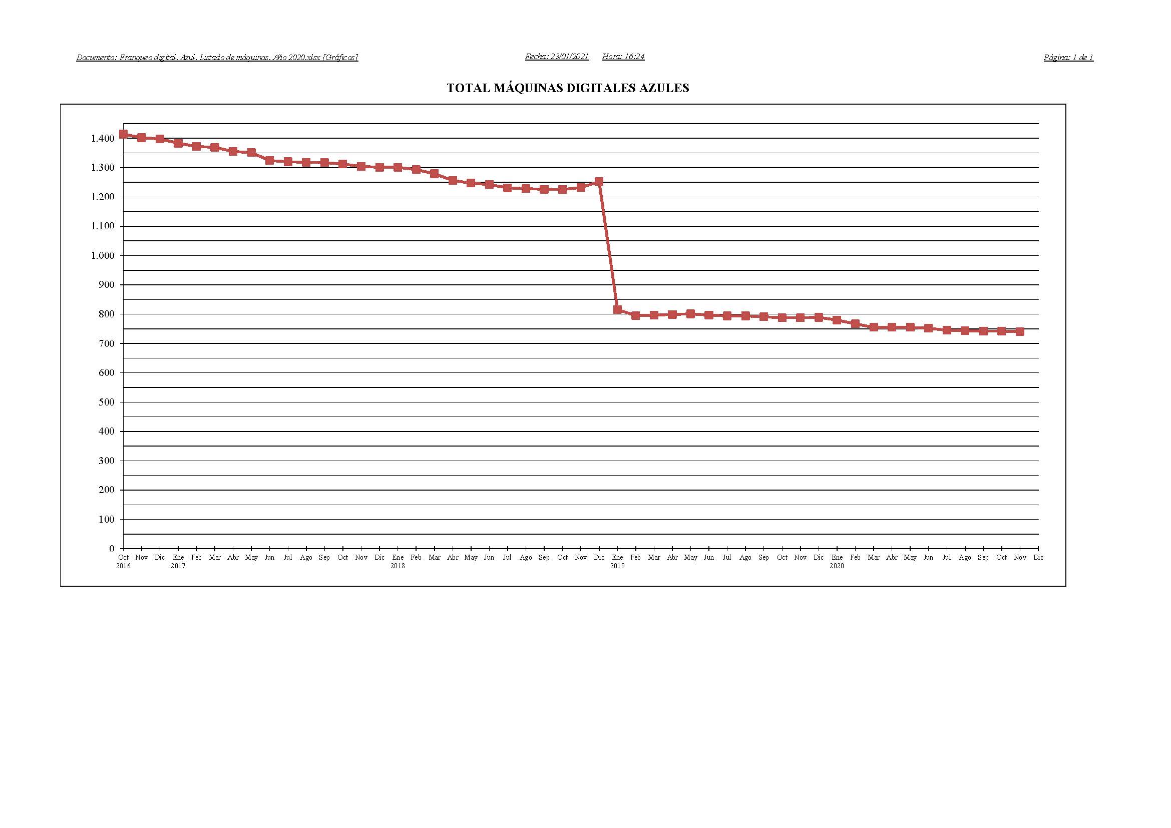 - Al 30 de noviembre del año 2020, existían un total de 741 máquinas de franquear digitales en funcionamiento. El parque existente, se había reducido en 1 máquina en comparación con el final del mes anterior.