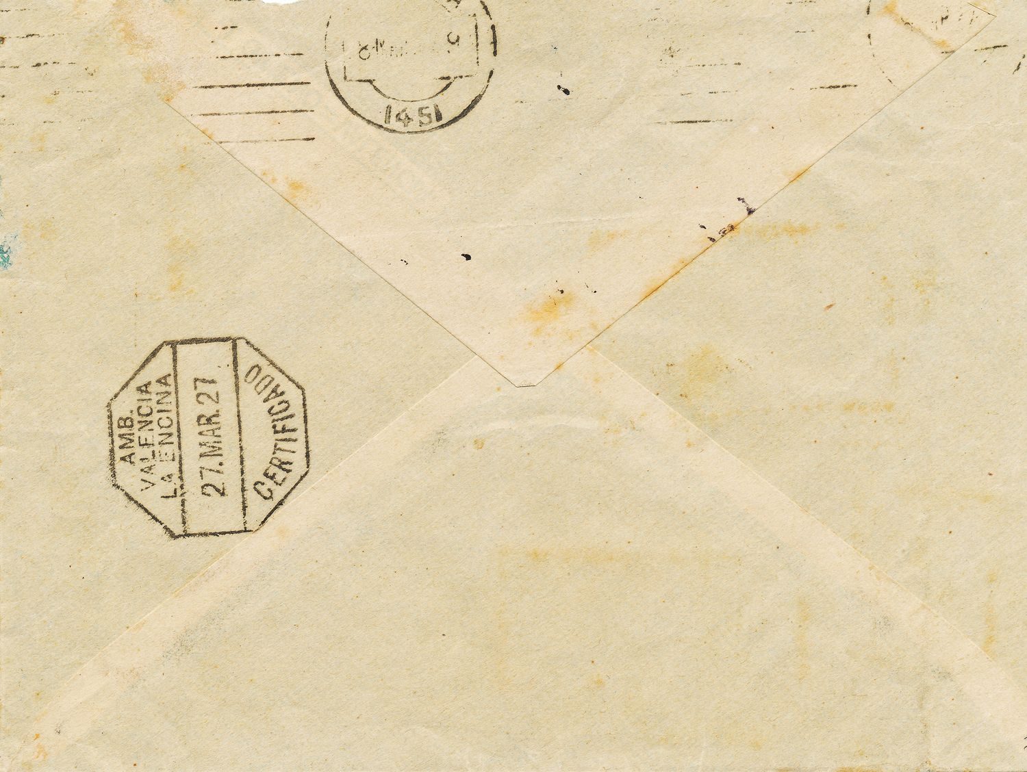 Ambulante. Valencia-La Encina. Amb. Certificado. 1927-03-27. Reverso. Baja.jpg