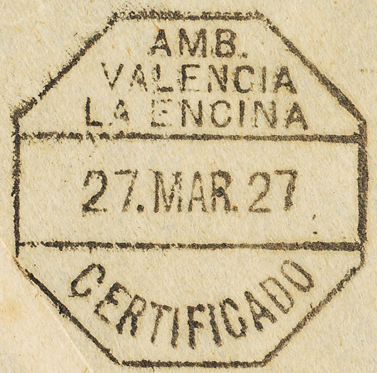 Ambulante. Valencia-La Encina. Amb. Certificado. 1927-03-27. Anverso. Baja.jpg
