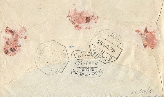 Reverso de carta certificada de Guadalajara a Villanueva y La Geltrú con dos ambulantes para catalogar.