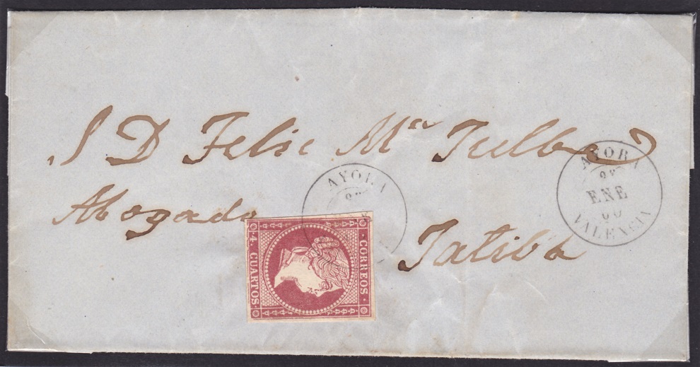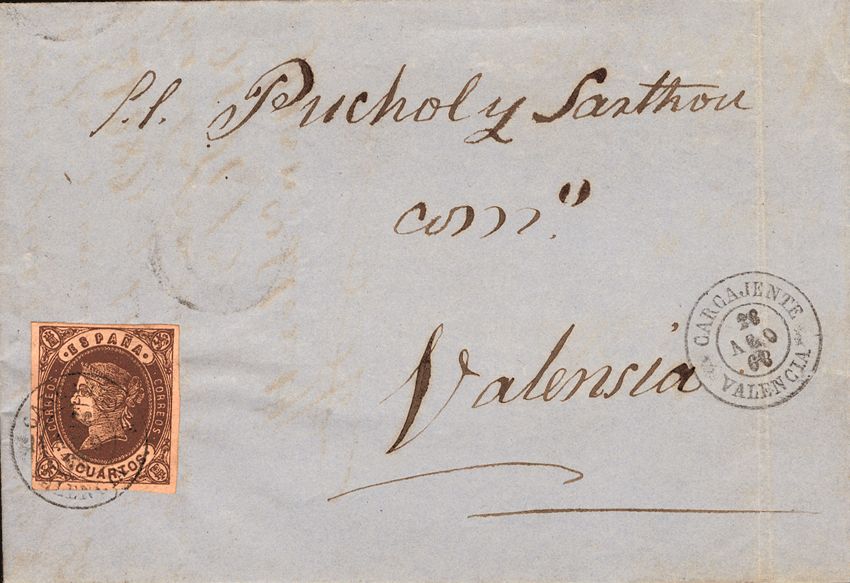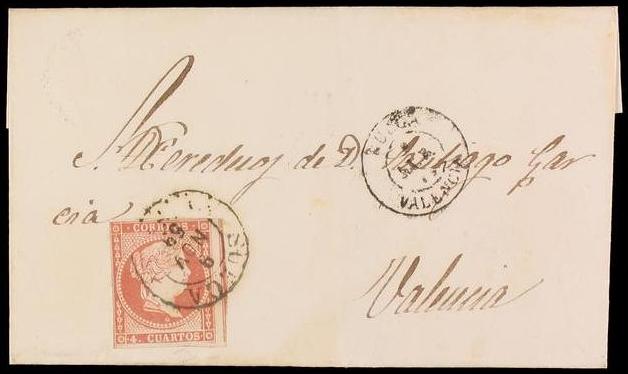Valencia en carta a Segovia, sello de 4 Cuartos de 1.856-59
