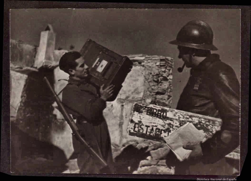 Acabo de tropezarme con esta foto tomada en el sector republicano durante la batalla del Ebro. El soldado transporta el buzón de la estafeta de campaña...