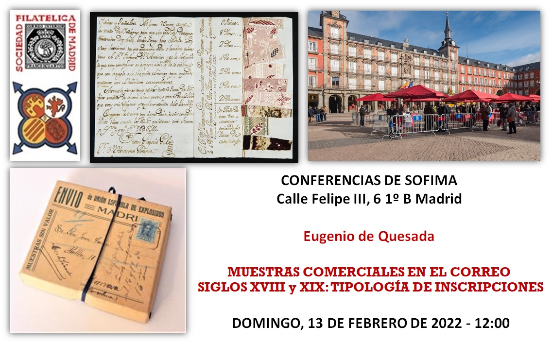 La conferencia está dedicada al excelente estudio en que se basa la colección de Eugenio de Quesada “Correspondencia con Muestras Comerciales en España: Prefilatelia y Emisiones de Isabel II a Alfonso XIII”, galardonada con medalla de oro en la Exposición Filatélica Nacional de 2021. En su presentación, el conferenciante muestra un exhaustivo inventario de cartas de su colección con las diversas inscripciones manuscritas conocidas en aplicación de la tarifa postal de muestras sin valor, y diversos ejemplos de bolsas y sobres contenedores y etiquetas para paquetes utilizados para el envío de muestras en España en el siglo XIX y principios del XX, así como franqueos certificados, excepcionales y curiosos en aplicación de esta tarifa.