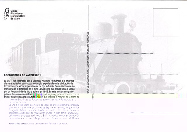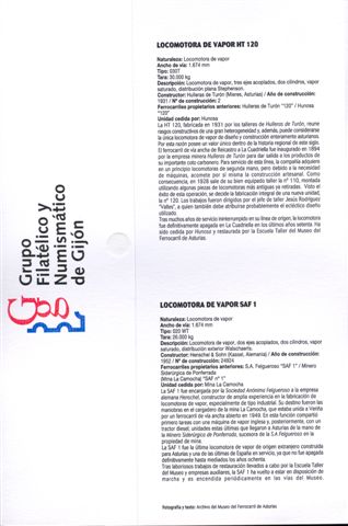 El Grupo Filatélico y Numismático de Gijón ha emitido dos sellos personalizados, como Homenaje a la Máquina de Vapor, reproduciendo dos de las locomotoras que existen en el Museo del Ferrocarril de Asturias: la locomotora HT 120 y la SAF 1.