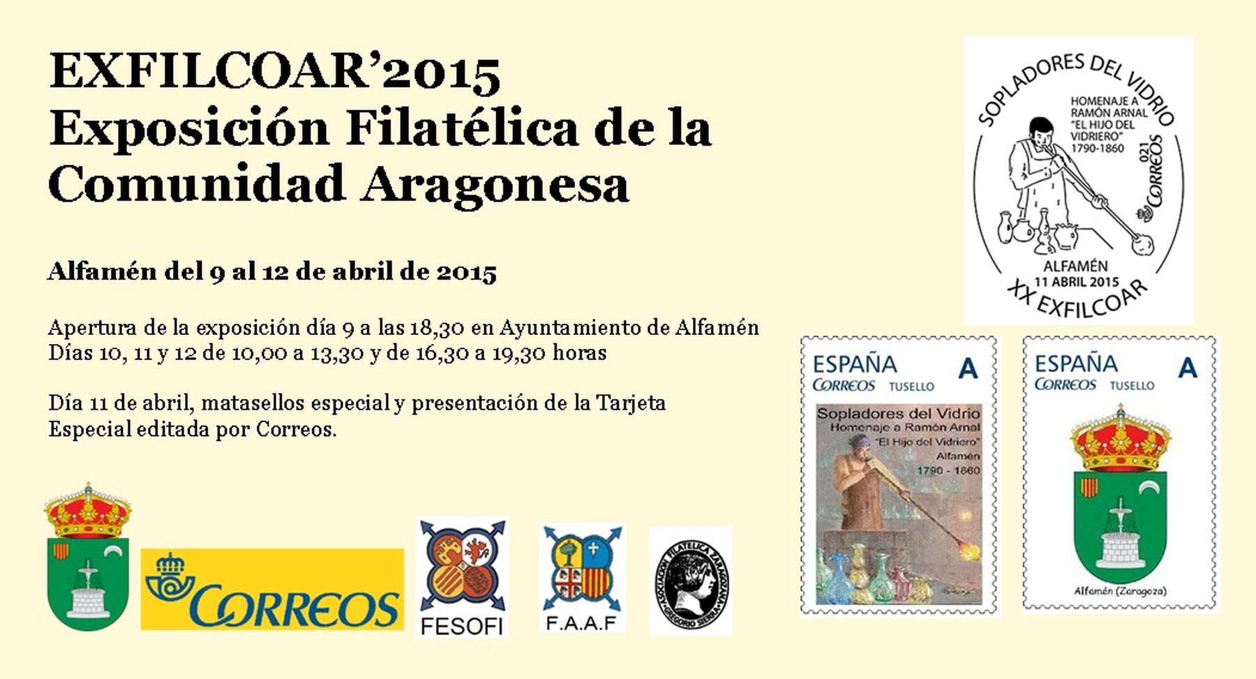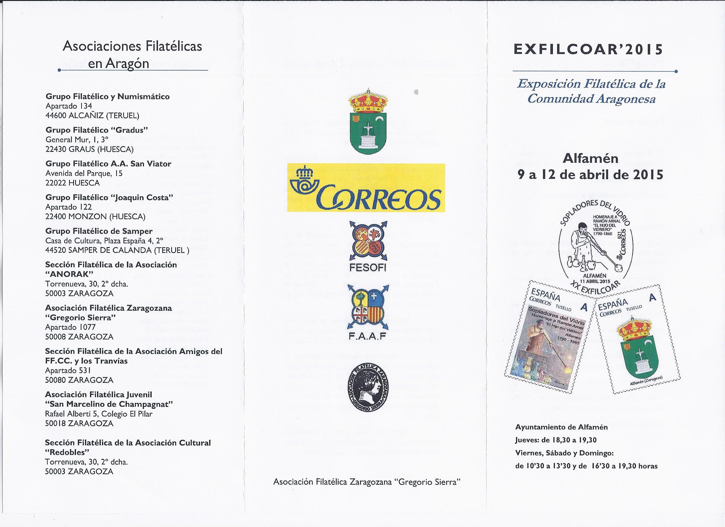 Del 9 al 12 del pasado mes de abril del año 2015 se celebró en el Ayuntamiento de Alfamén (Zaragoza) la EXFILCOAR 2015 - Exposición Filatélica de la Comunidad Aragonesa.