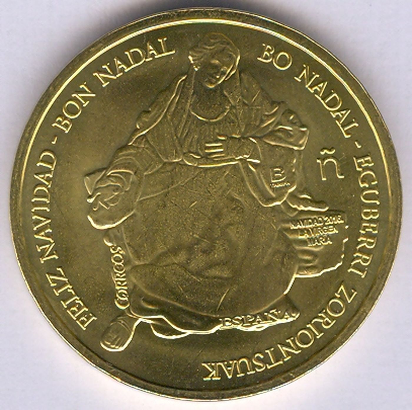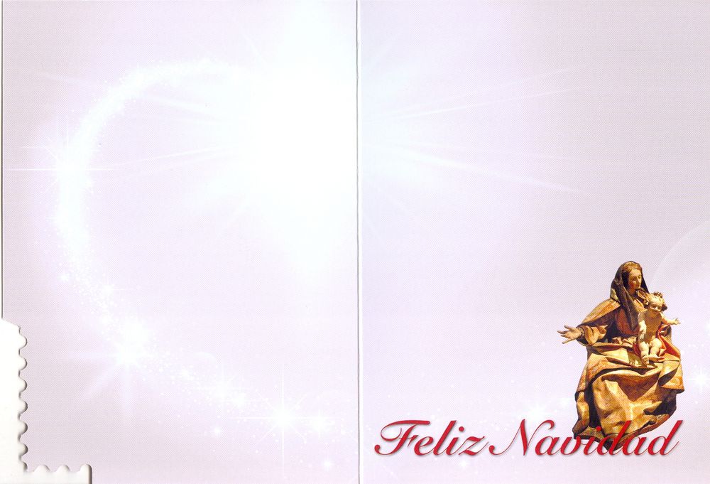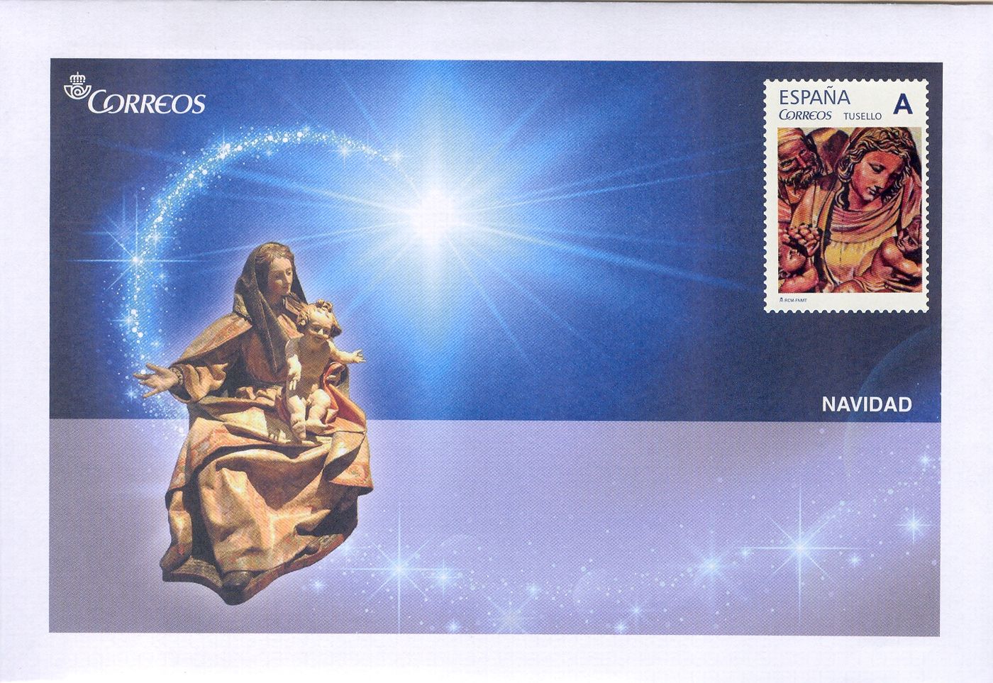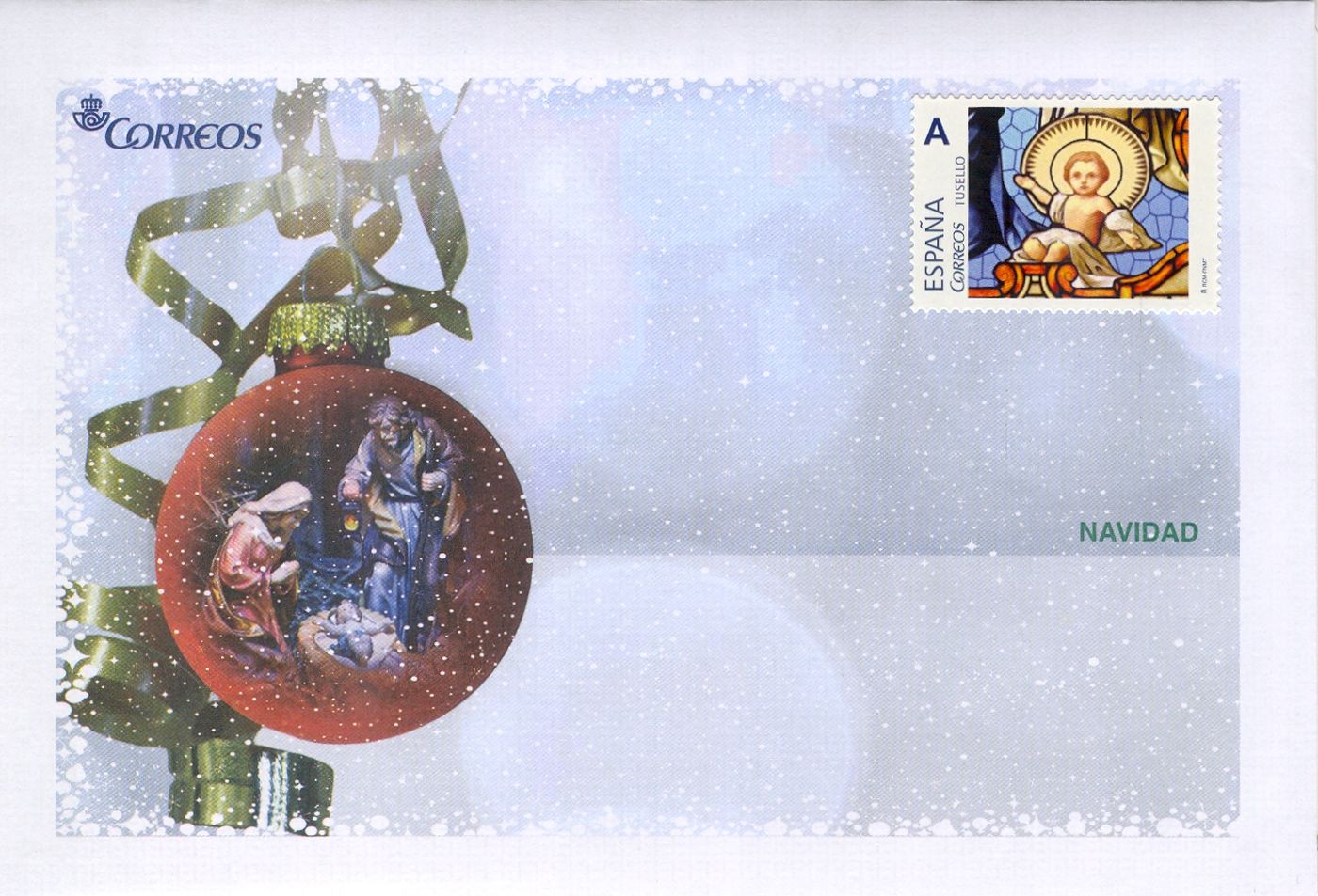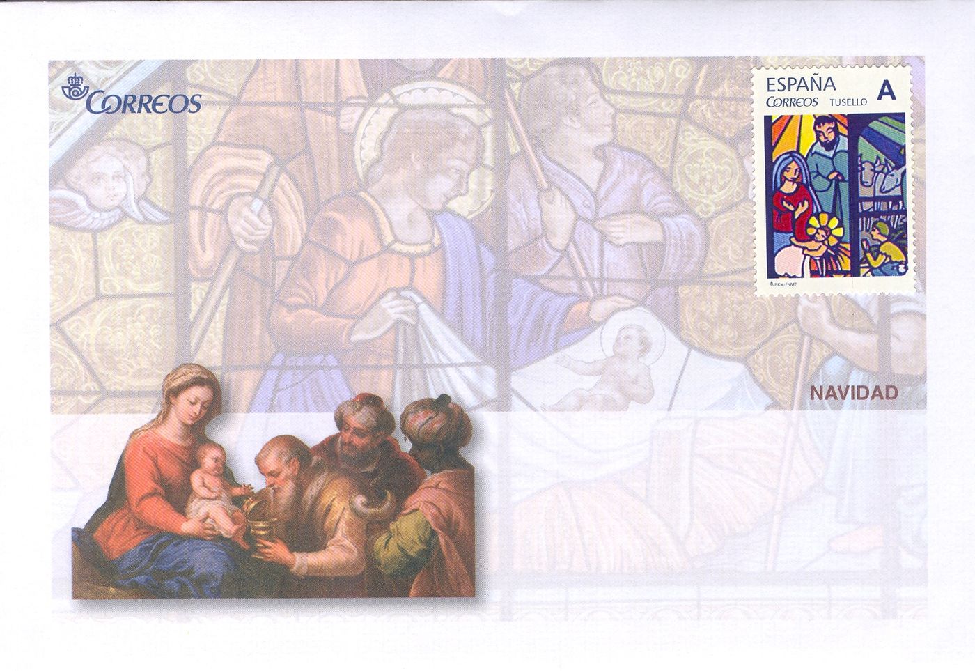 Este sello se ilustra con una vidriera que representa una escena típica del nacimiento del Niño Jesús, con la Virgen María y San José. Se acompaña con el mensaje Feliz Navidad escrito en las cuatro lenguas oficiales que se hablan en España. En la impresión del sello se ha añadido cold foil para acentuar el colorido y dar mayor profundidad a la imagen de la vidriera.
