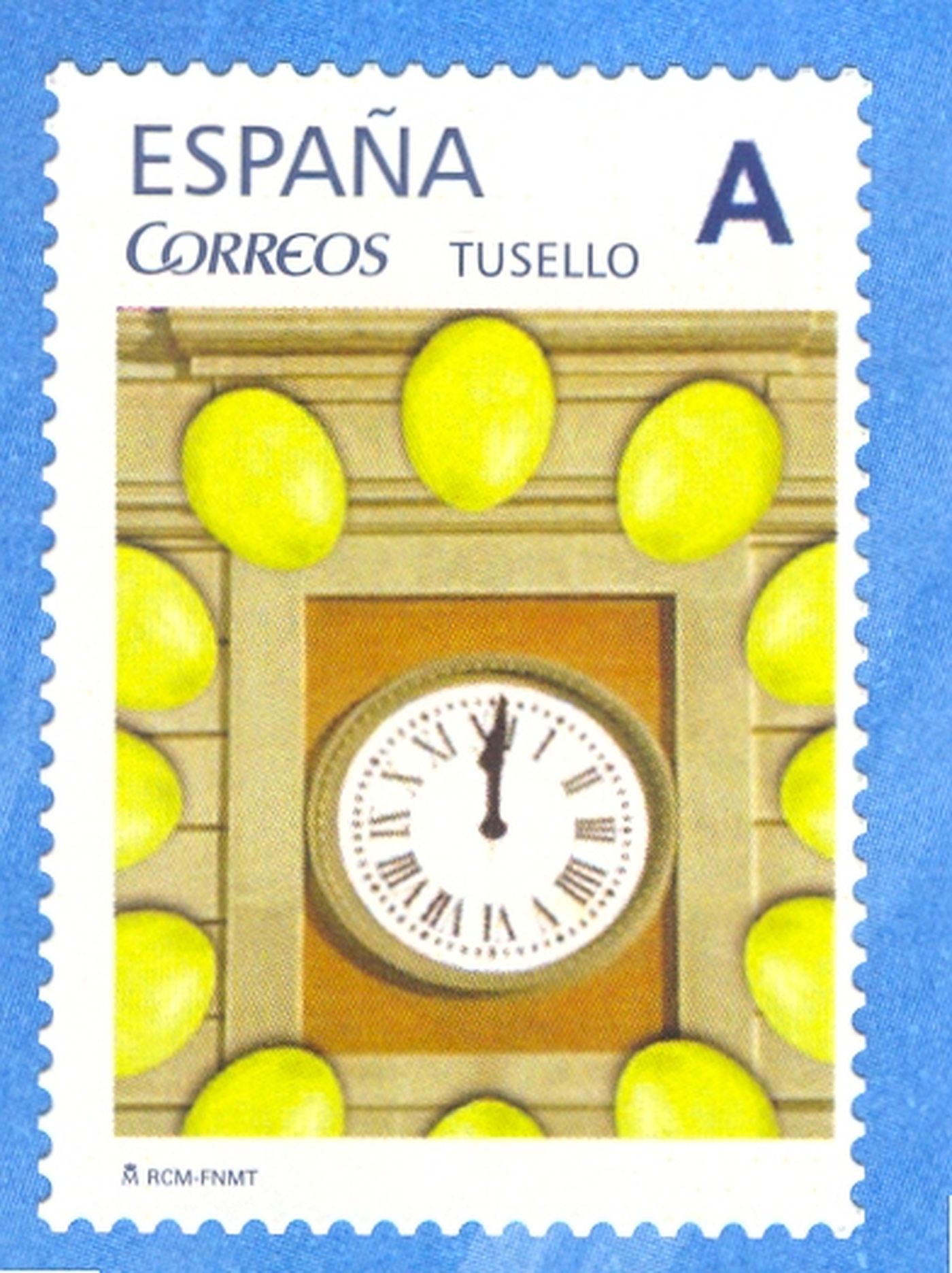 ¡Feliz Año! es el mensaje lanzado en este sello, que aparece ilustrado con el reloj de la Puerta del Sol de Madrid y las doce uvas.
