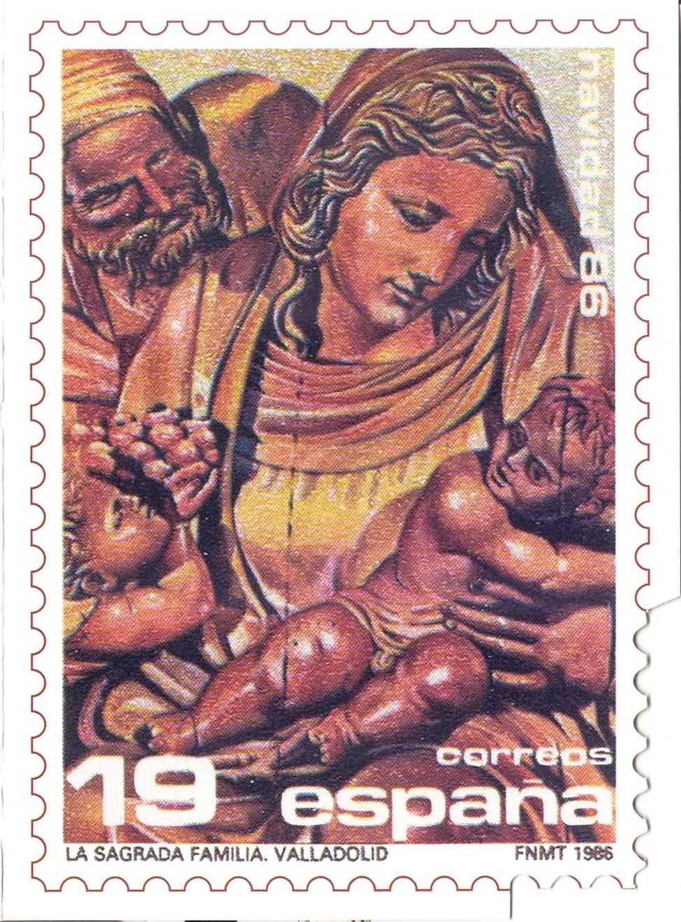 El sello muestra una escena de la Sagrada Familia, que es un fragmento de un bellísimo altorrelieve de madera sin policromar, que se encuentra en el Museo Nacional de Escultura de Valladolid.