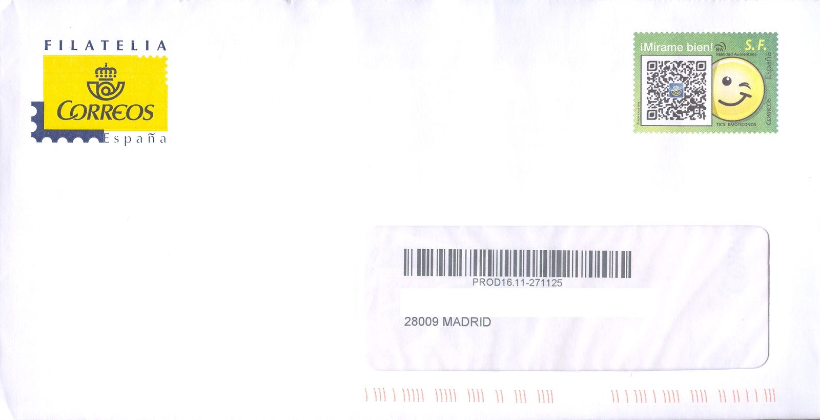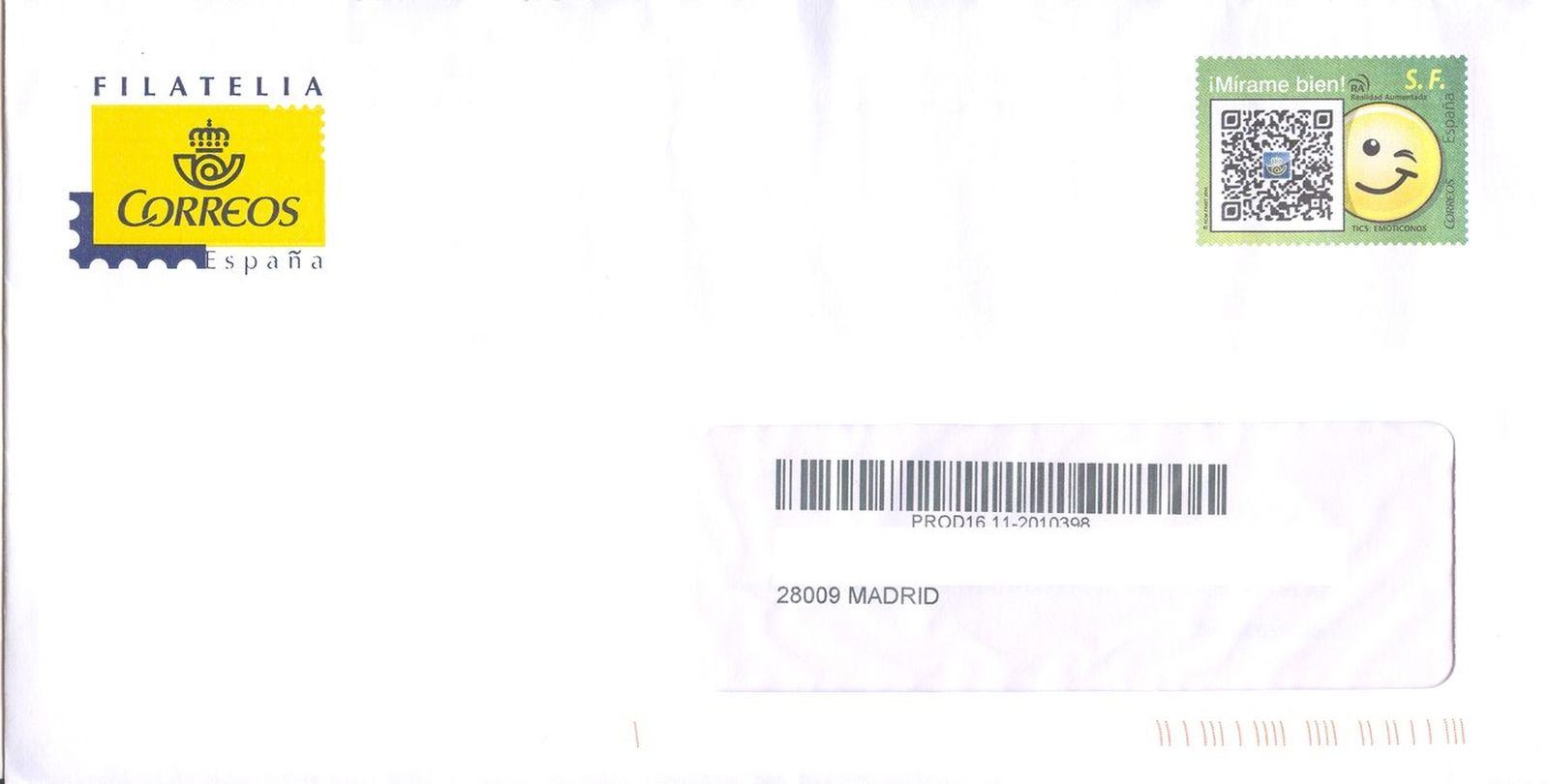 Y la publicidad comentada en el primer mensaje, se envió en sobres del Servicio Filatélico, con referencia SAP 400067 - SF-2-V, fabricados por la empresa UNIPAPEL en el año 2014, con remitetne de la Subdirección de Filatelia.