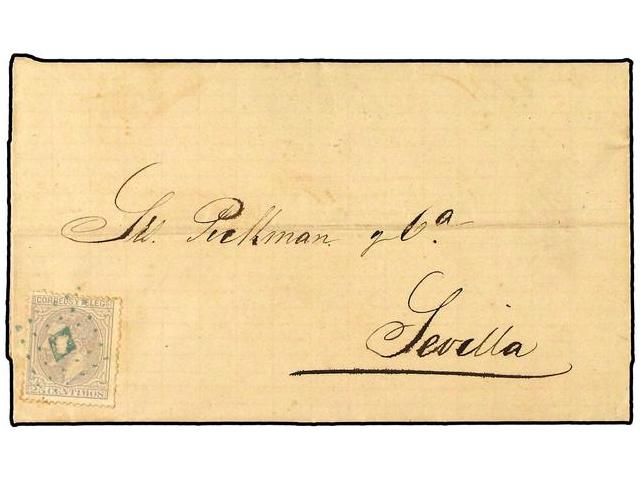 Carta de Laredo (Santander) a San Juan de Potosí (Méjico) franqueado con cuatro ejemplares del alfonsillo matasellados por rpmbo relleno de puntos y dos de ellos por fechador tipo trébol negro de Laredo. Al dorso varios fechadores de tránsito y llegda. Una de las más expectaculares piezas de este sello que he visto.