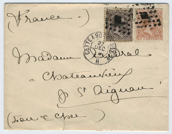 A pesar de no puedo aportar algo más al tema del Alfonsillo quisiera aprovechar la ocasión de mostraros (y especialmente a nuestro amigo Julio) una cartita con Pelones a Francia con -como creo yo- el mismo rombo especial de Salvatierra usado (veinte años más tarde) en el diciembre de 1889. ¿Que os parece?