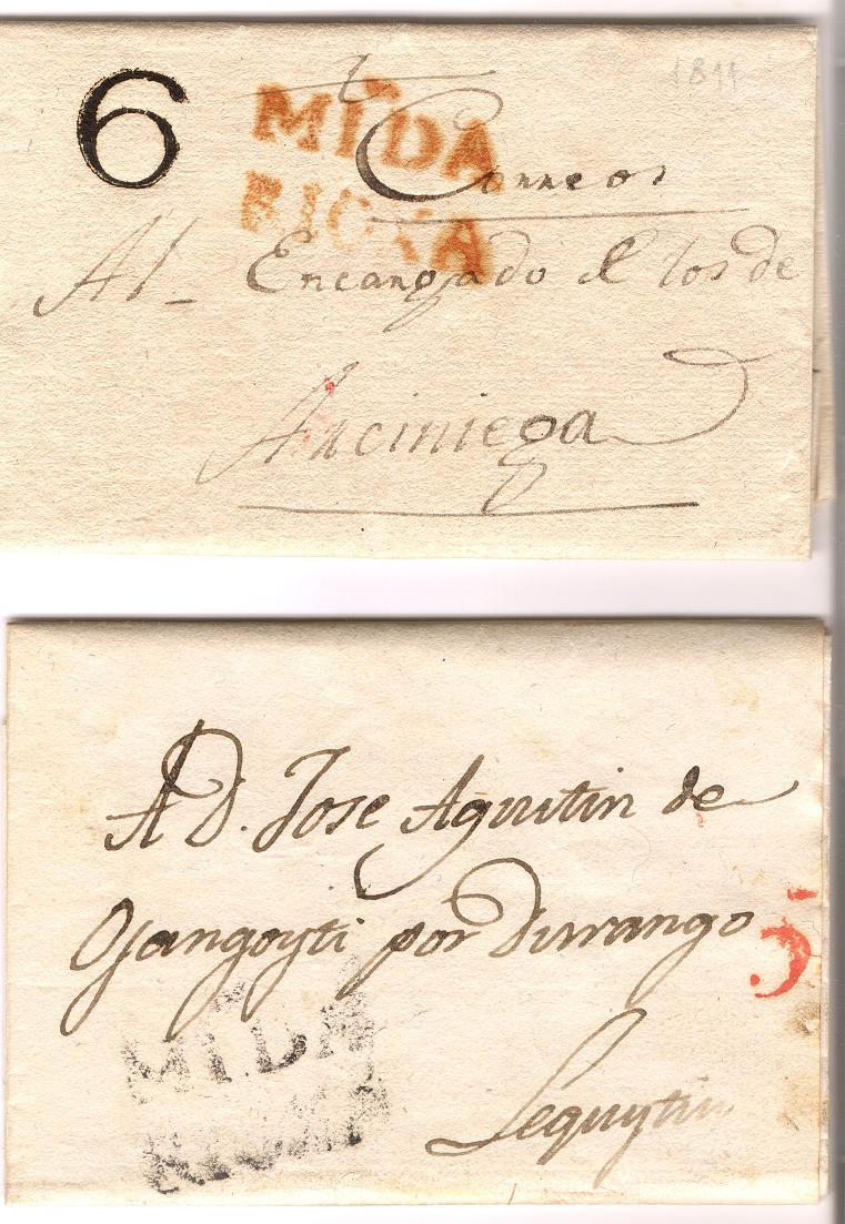 PE-2004 nº6, con años de uso 1815/17 y 1836/38 parece que se usó simultaneamente a veces con la marca anterior, MDA/RIOXA. Yo tengo dos: de 1821, Armiñón a Madrid,con porteo 7 negro de fecha, y de 1823, Miranda a Lequeitio, con porteo 6 grande rojo, de Vitoria.