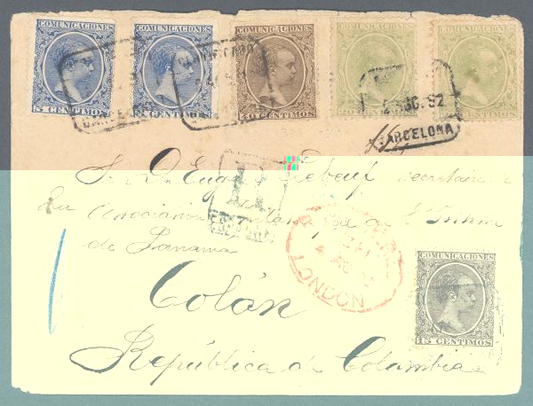 Es una carta certificada desde Barcelona a Colón en Colombia con trásito por Londres con un franqueo realmente espectacular y creo que digno de aparecer en este hilo. Espero que os guste.