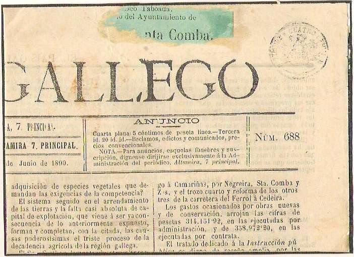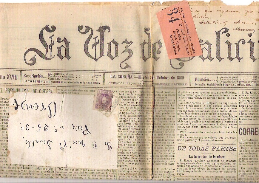 Hace tiempo se abrio este hilo sobre timbres de periodicos que no ha tenido muchos seguidores.El tema de los timbres y franqueos de periodicos ha sido muy poco estudiado en España.Me permito "reavivarlo" un poco y subo un ejempleo de franqueo de periodico.Se trata de un ejemplar de La Voz de Galicia(Martes,3 oct.1899)enviado a un suscriptor en Santa Comba(La Coruña).De alli se reenvia a orense.Lleva carteria verde de Santa Comba.
