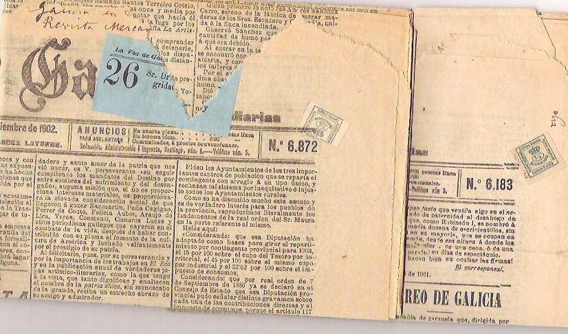Dos ejemplares de la Voz de Galicia (1901 y 1902),el sello del 1/4 esta sobreimpreso con la tipografia del periodico.Esto se hacia pues para ganar y tiempo se adherian los sellos en las hojas en blanco antes de poceder a la impresion.