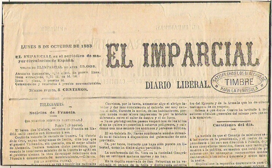Madrid.1883.Desde el 21 de Julio de 1876 se le conde a el Impacial el "privilegio"de poder estampar el directamente en sus talleres el timbre sin necesidad de llevar las resmas a hacienda.