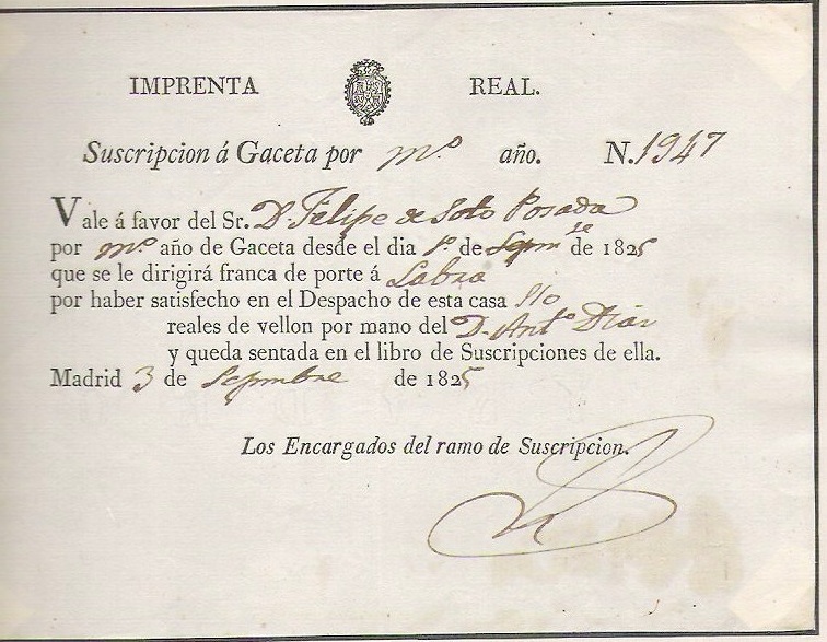 1825.Recibo de la Imprenta Real por la suscripcion a la Gaceta que se "dirigira franca de porte a Labra".