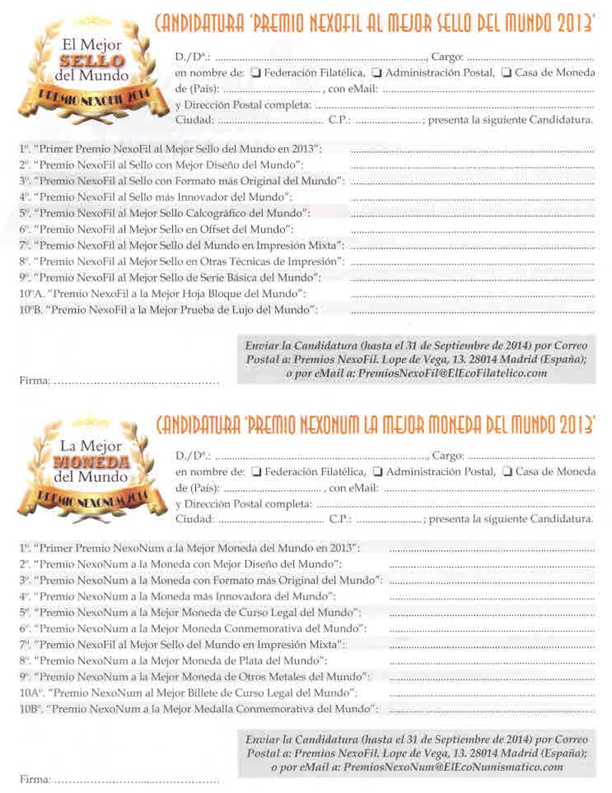 Se trata de la convocatoria para otorgar los Premios Internacionales NexoFil 2014 y NexoNum 2014 a los mejores sellos y monedas del mundo, emitidos durante el año 2013.