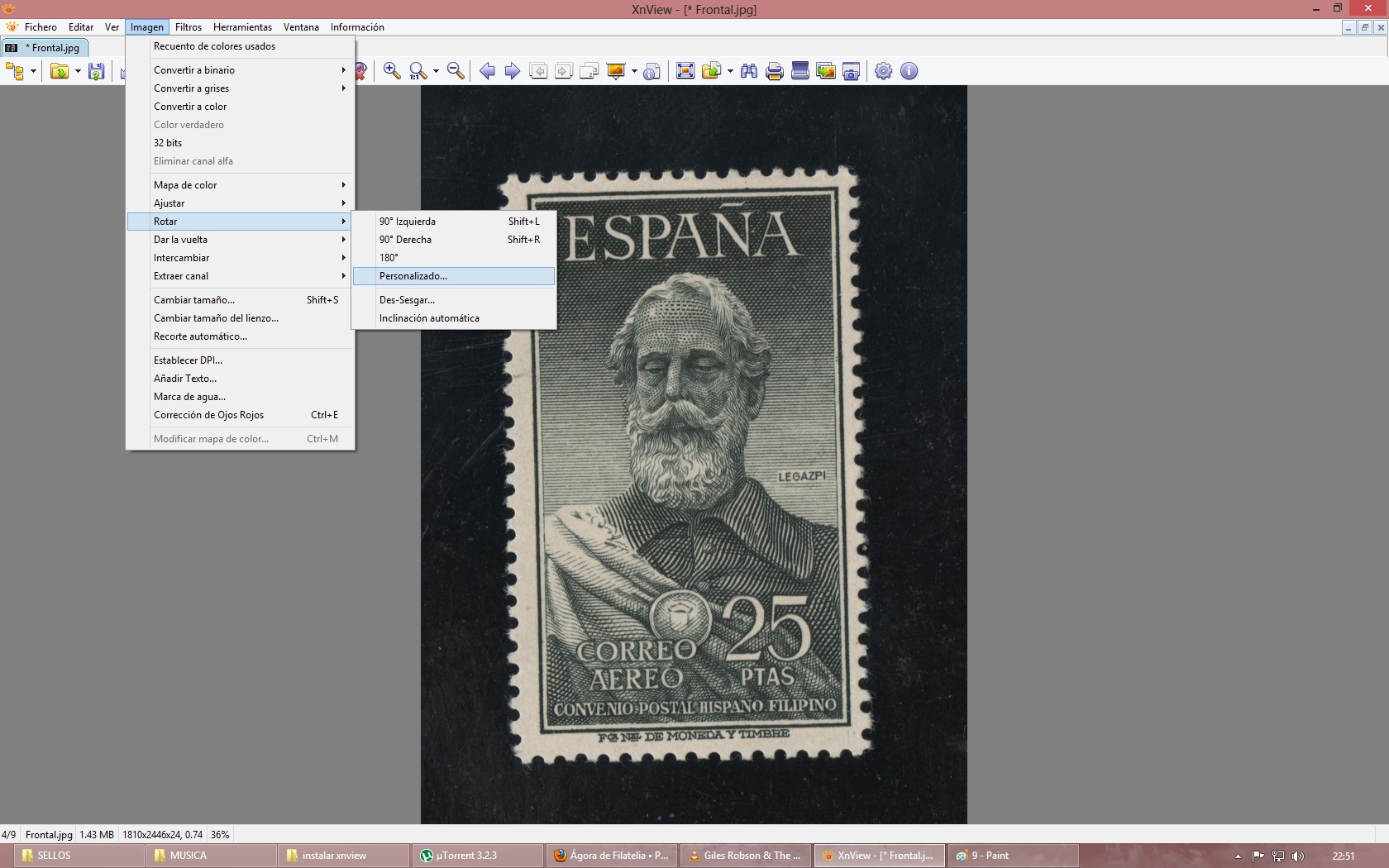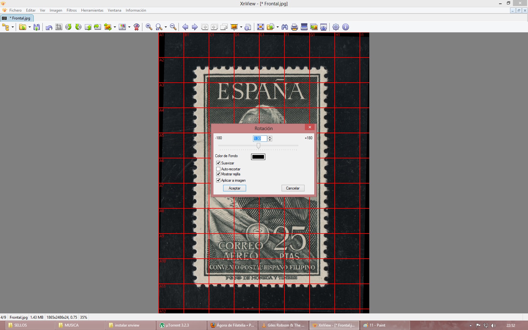 En mi caso tengo el sello #1124 Legazpi y ha salido un poco torcido. Ahora nos vamos al menú de herramientas y entramos en Imágen-> Rotar-> Personalizado Y nos encontraremos con la siguiente pantalla. Debemos tener seleccionada las opciones 'Suavizar', 'Mostrar rejilla' y 'Aplicar a la imágen'. Como vemos en la siguiente imagén, he ido dandole a las flechas de arriba y el sello ha ido rotando. Como tenemos la rejilla de referencia nos será más sencillo centrar el sello. Si ya tenemos el sello centrado, sólo nos queda darle a aceptar. Y ya tenemos nuestro sello centrado!!!!