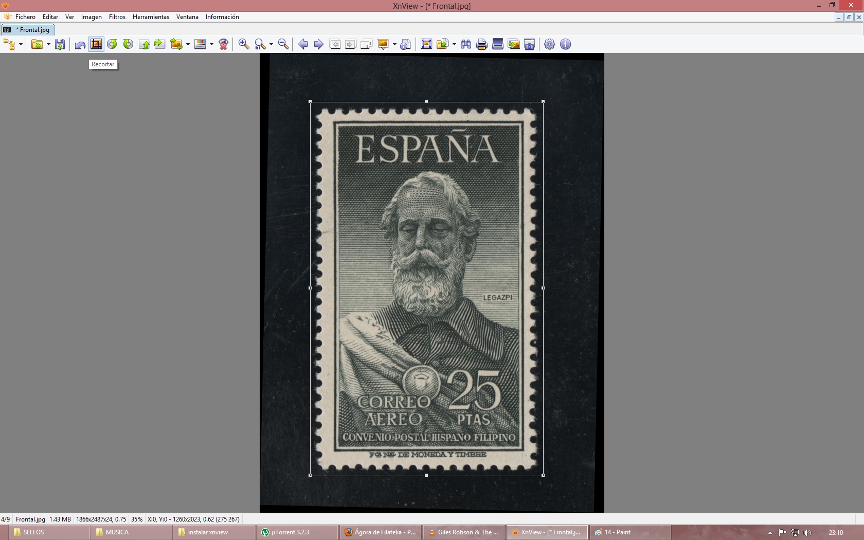 Seleccionamos con el ratón la zona a recortar. Nos podemos pasar si queremos, luego aparecen 8 puntos para poder modificar la zona. Una vez ya tengamos la zona a recortar, simplemente tenemos que hacer click en el quinto botón de arriba y que veréis marcado como 'Recortar' en la imagen. Ahora ya tenemos una imagen del sello solamente. Vamos, lo interesante!!
