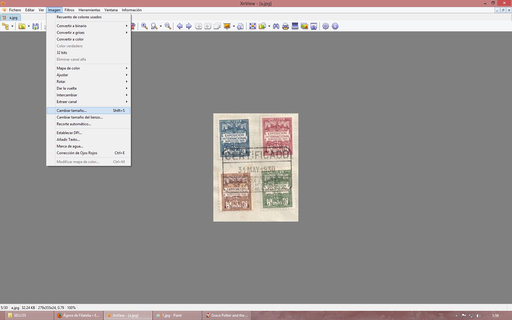 Arriba tenemos lo que mide en pixeles el sello. Simplemente le iremos bajando el tamaño. Probar de 100 en 100 más o menos. En nuestro ejemplo pasaré de Ancho 1260 a 1150. Y ahora le damos a Aceptar. Y guardamos la imagen. Ahora hemos bajado de esos 400kbs teniendo una imagen lo más grande posible.