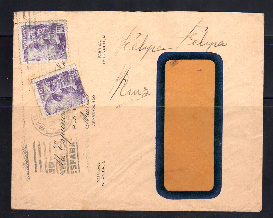 Sobre franqueado con dos sellos 20 cts. Franco. Matasellos rodillo Madrid
