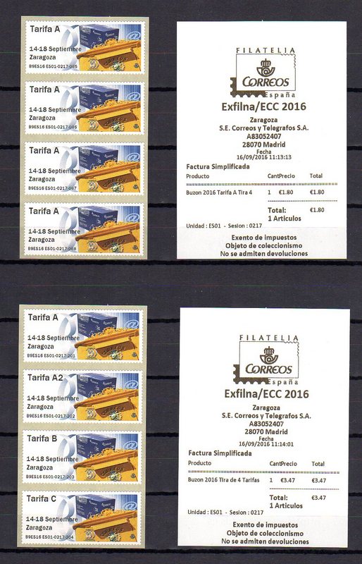 ATM´s Zaragoza Buzón, serie cuatro valores tarifa A y serie cuatro tarifas con sus recibos