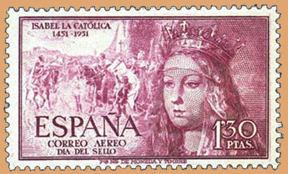 En el sello de 1951, emitido por el V Centenario del nacimiento de Isabel la Católica, se ve el detalle de La Rendición de Granada de Francisco Pradilla, en la que Boabdil, último rey de Granada miembro de la dinastía nazarí, entrega las llaves de Granada a los Reyes Católicos. En ese cuadro, al fondo, supongo que lo que se ve es la Alhambra...