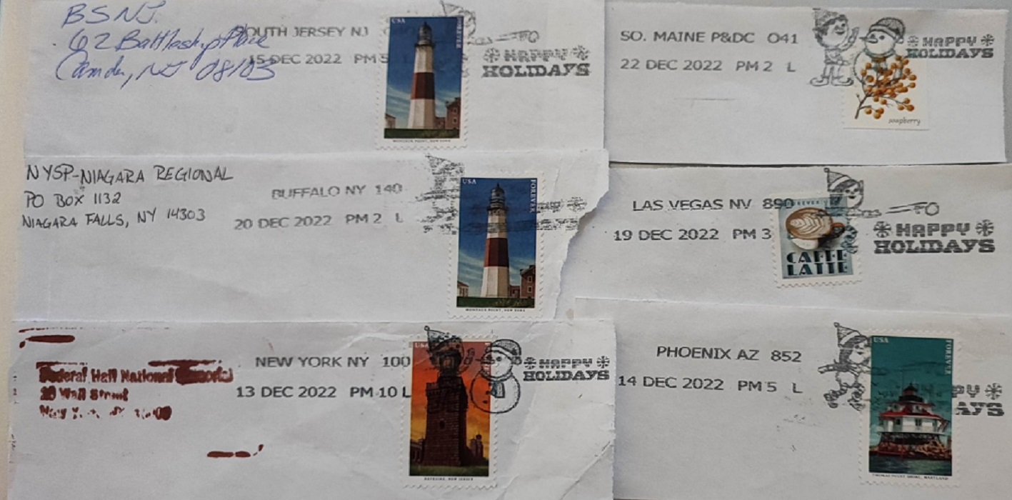 Son de diferentes puntos de Estados Unidos, son iguales pero cambia la ciudad en el matasellos.