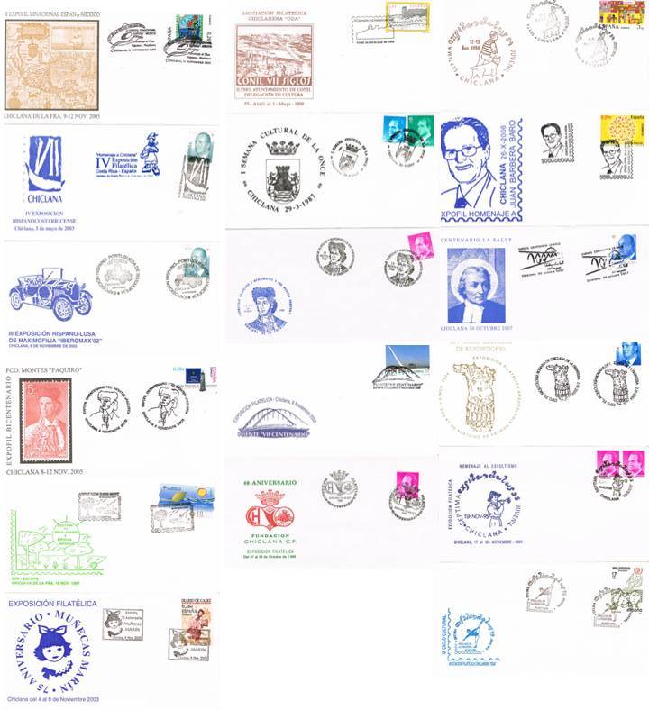 DESCRIPCIÓN: España. 17 sobres franqueados y obliterados con diferentes matasellos especiales de Chiclana de la Frontera (Cádiz). Ninguno repetido.