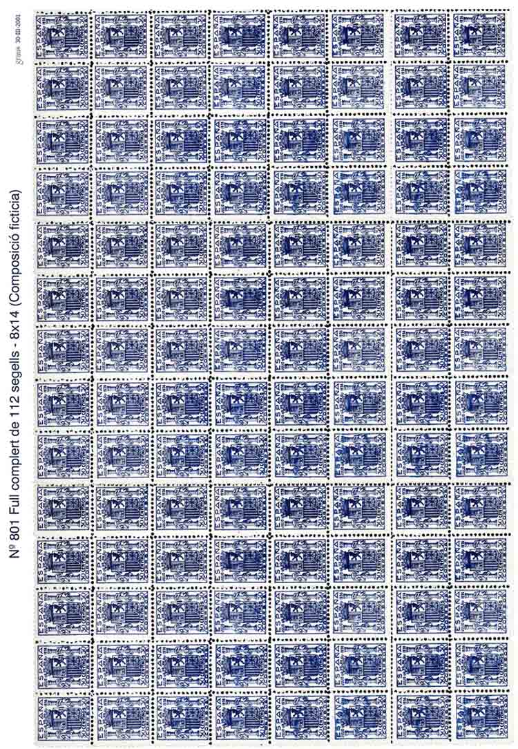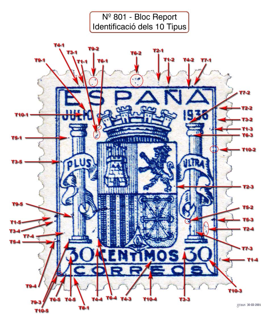 La ausencia de algunas marcas de identificación no es extraño se produzcan debido a que algunas de las mismas no aparecen dependiendo del desgaste de la piedra litográfica, de la falta de esmero en la impresión o de cual era la situación en la piedra completa de 112 ejemplares, la cual muestro, composición ficticia pero ajustada a la realidad que hice cuando trabajé el plancheo de este sello del que me preocupaba la enorme facilidad de falsificación debido a la sencillez del diseño...